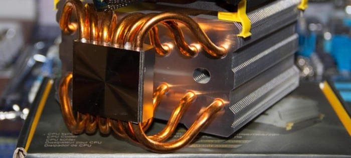 The cooler comes with a fan pre-attached. 6 copper heat-pipes come out from the CPU-socket and goes through the aluminum-fins.