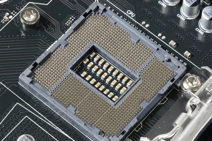 Here we have a view into the LGA1150 socket, using the ILM system that has traditionally worked quite well for keeping the processor firmly seated against the socket pins. Good pin contact is very important to ensure a clean signal transmission and optimal performance. Poor pin contact can cause heat and even damage so a proper socket/ILM setup is essential. You can see that the socket looks very similar to the LGA1155 socket, and if you were to count them there are just 5 pins less.