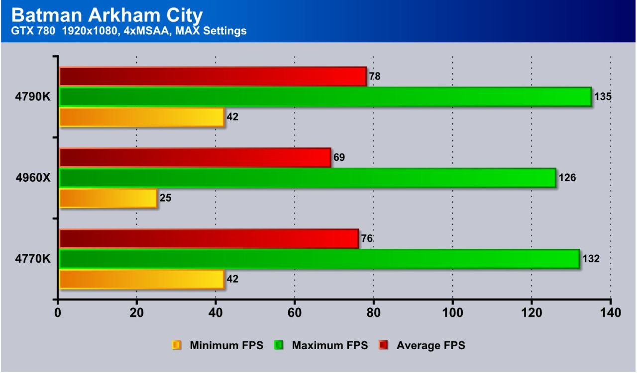 Discrete GPU results once again hover with not much gain but Batman definitely shows a bit more favor to the Haswell based CPUs.