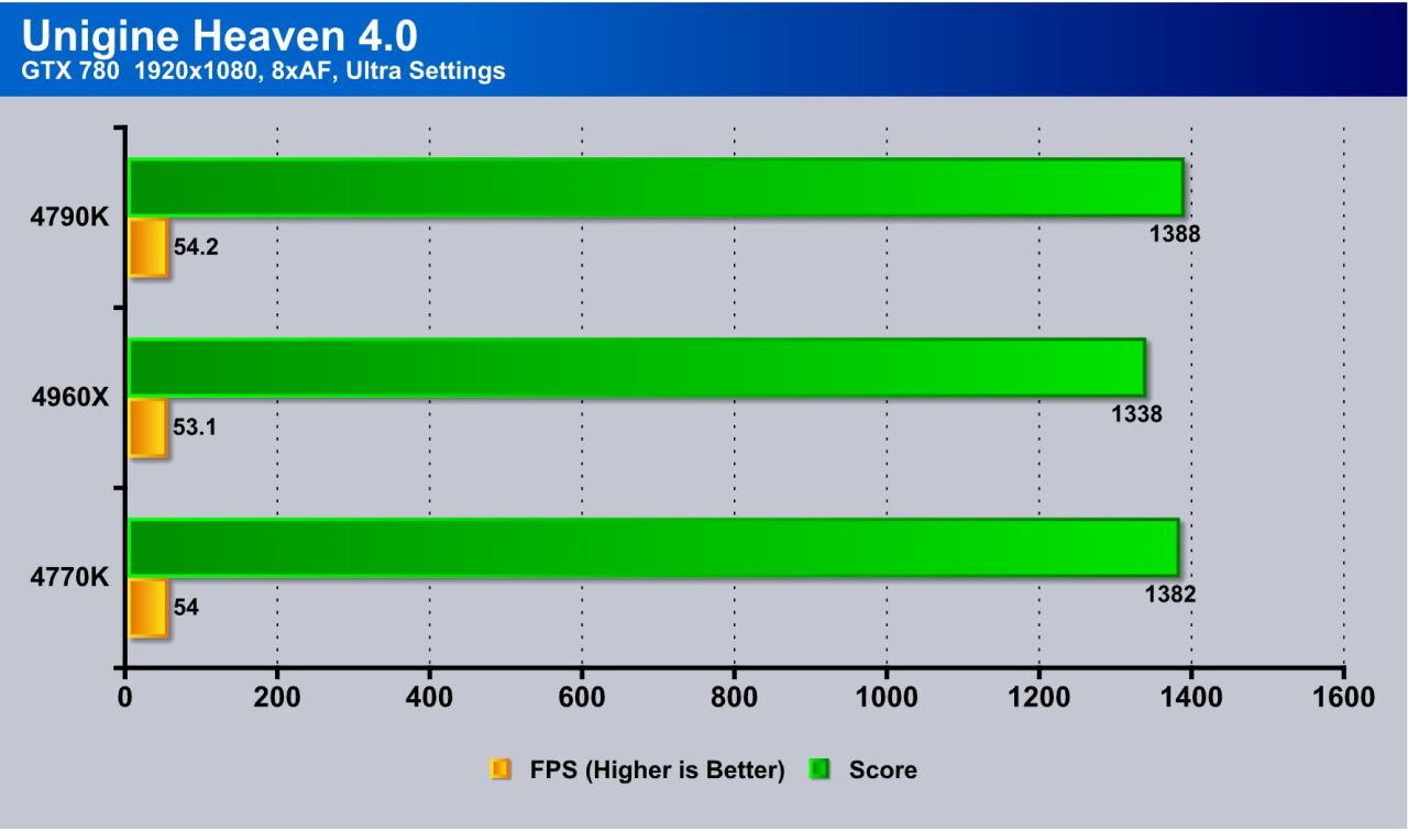 Unigine Heaven on a discrete GTX 780 sees very similar performance as the 3.0 PCIe bus simply moves more than enough data at great efficiency that there is really no major advantage from extra threads here. The frequency does help a little bit but the margin is small.