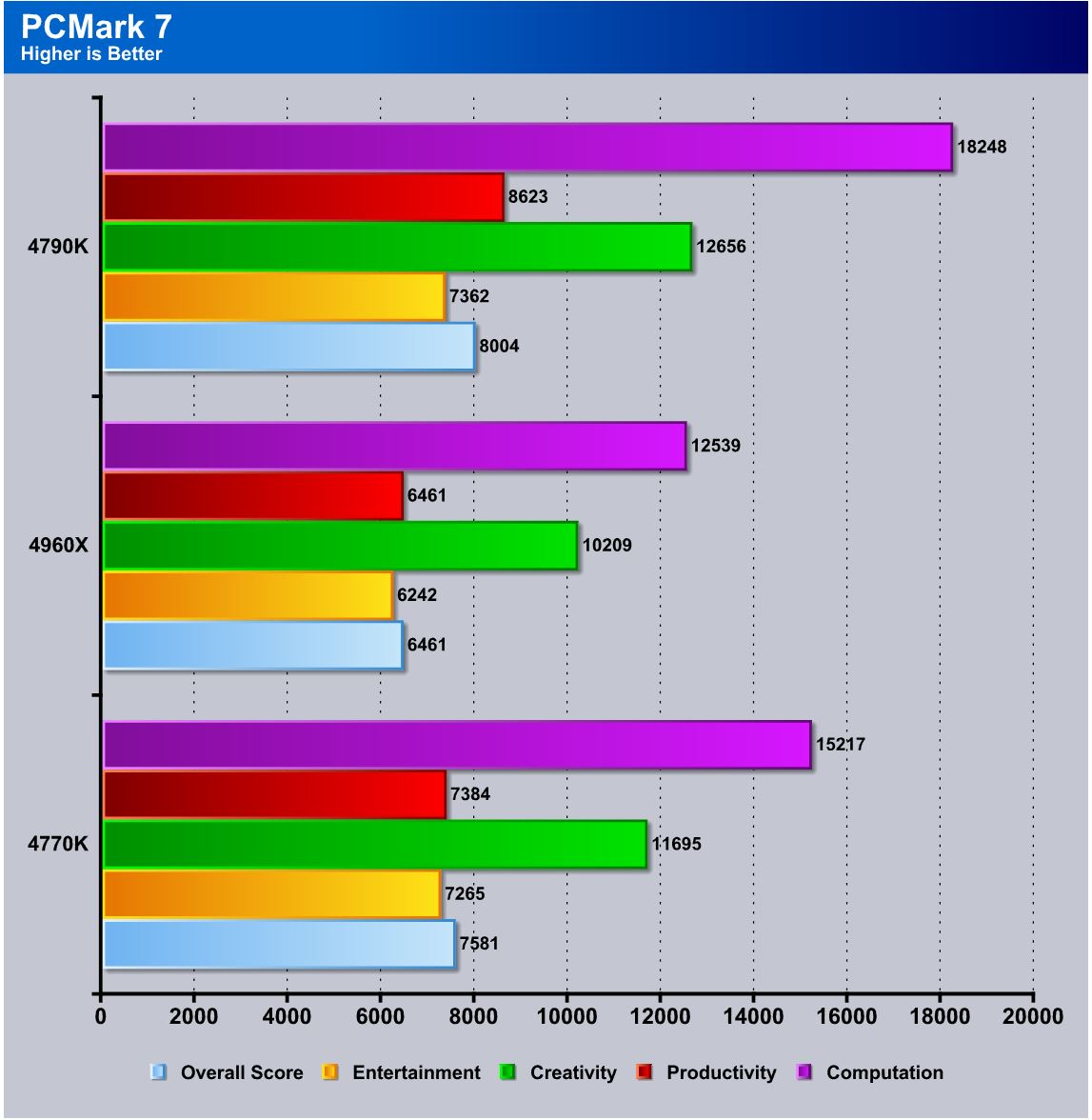 TrueCrypt is a real world application that gives a good indication of the true performance of our latest processor. The AES capability helps push the performance higher in the encryption performance here but once again the higher core count still wins but not by a huge enough margin to realistically recommend the CPU that costs 3X as much. the 4790K definitely sees the fruits of the speed bump getting a very nice jump in performance here.