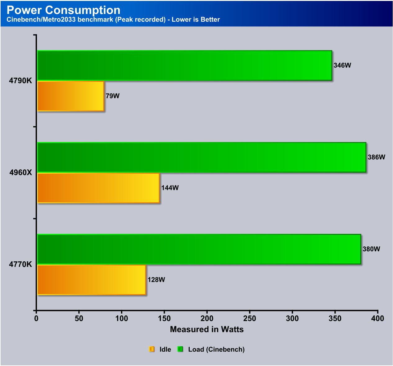 For overall power consumption we loaded the board in stock form with the Discreet GPU (GTX 780) in use and tested overall platform power with both the main SSD in use and a secondary storage drive to simulate normal system configurations. Loading was completed by running Metro 2033 along with Cinebench for a heavy rendering load on the CPU.