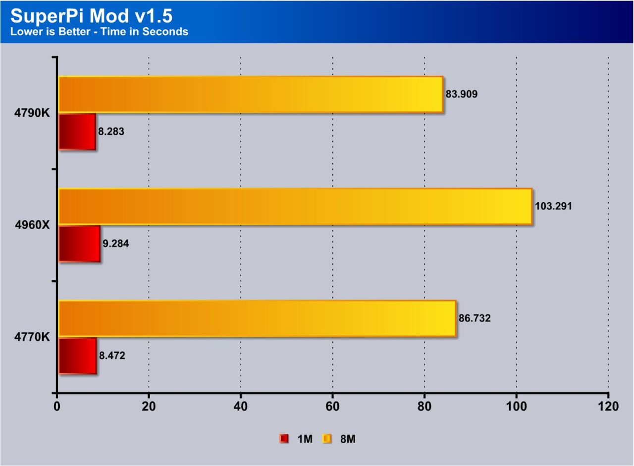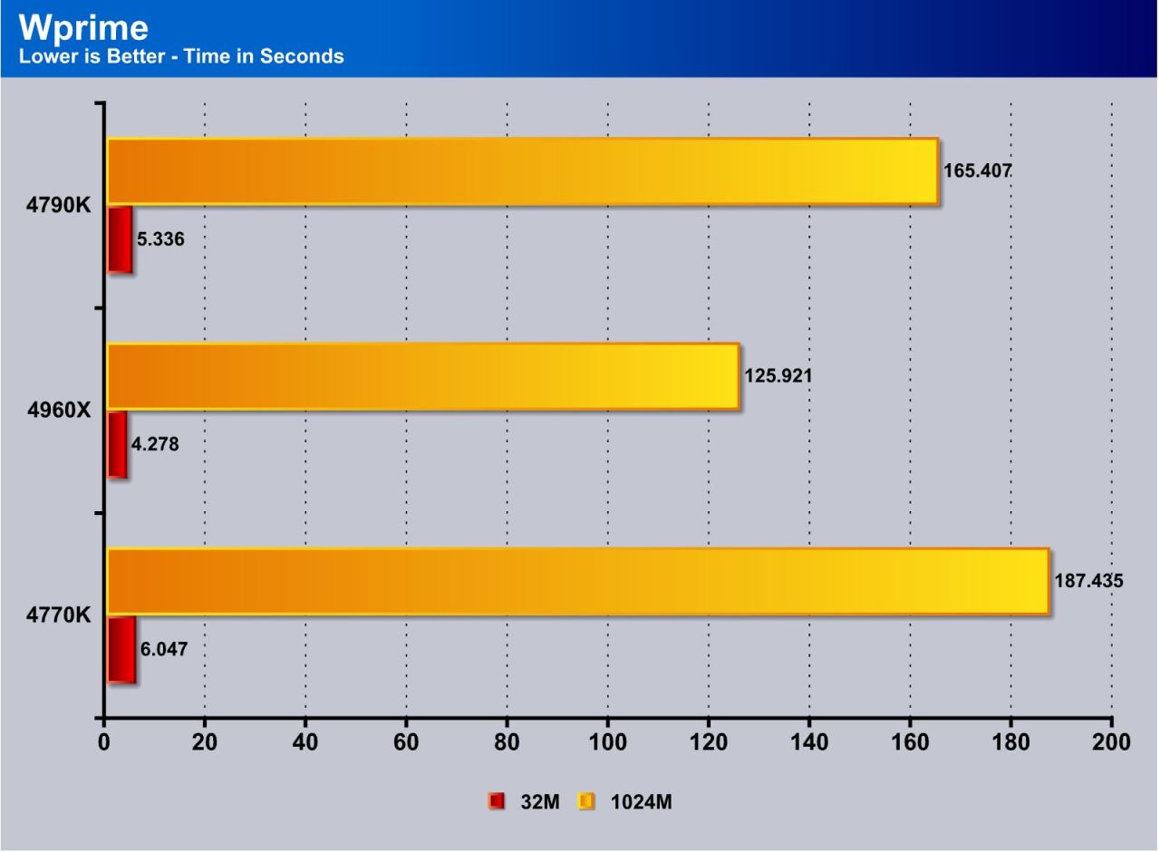 WPrime is similar to Superpi, but is multi core aware and you can set the core count. We used 8 cores to take advantage of the 4770K’s HyperThreading ability. (12 for 4960X) Here you can see the frequency gain is definitely verified as a performance boost as Wprime sees some definite quicker calculation times with a big jump in the long 1024 test.