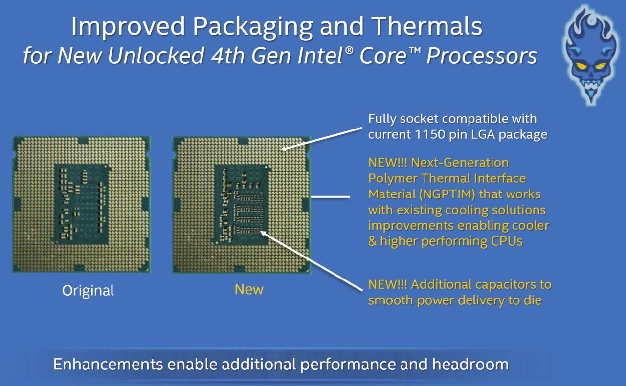 The new Devils Canyon is yet another 22nm model actually same basic die from the previous Haswell just with some extra goodies strapped on. The Caps on the bottom of the chip smooth out power and give it a cleaner power source to allow the much higher base clock speed to be out of the box stable and who knows maybe even lower operating voltages, but only time will tell.