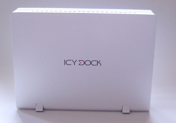 Looking at the back of the enclosure, you will find an on/off switch, two firewire ports, one USB 2.0 port, a power connector, a security cable kit insert slot, and a little gray tab that is used to pop the stands out on the right side of the drive. By including two firewire ports, ICY Dock allows you to chain link your existing firewire product. What’s also worth mentioning is the included security cable kit. It uses the same security lock found in many laptops so you can secure the hard drive to a heavy object. Also, note that the exhaust fan has been removed from this new enclosure. I guess in order to slim down the enclosure, ICY Dock has to take the fan out.