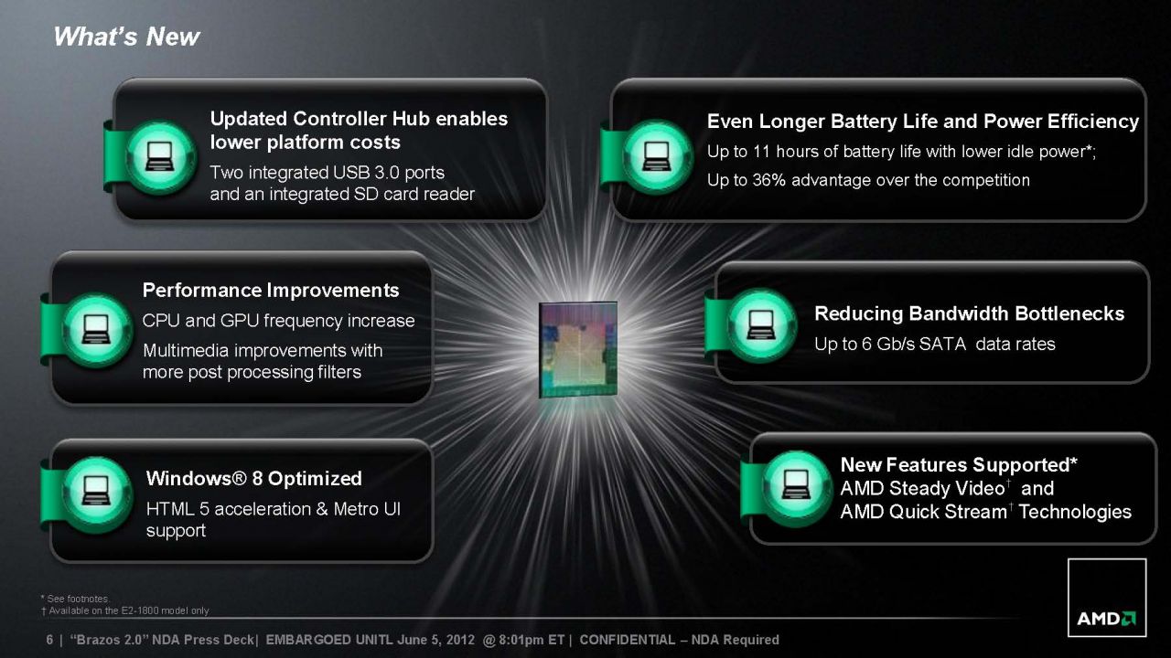 Unlike the Trinity APUs which had an upgrade on both the CPU and GPU front, Brazos 2.0 uses the same 40 nm “Bobcat” CPU core and the same GPU core as the last generation “Zacate” APU. While the current GPU uses a new model number, HD 7000, it is still architecturally the same GPU as the HD 6000. The new GPU does have an improvement in graphics, gained Steady Video and Quick Stream Technology that will help with smooth video playback.