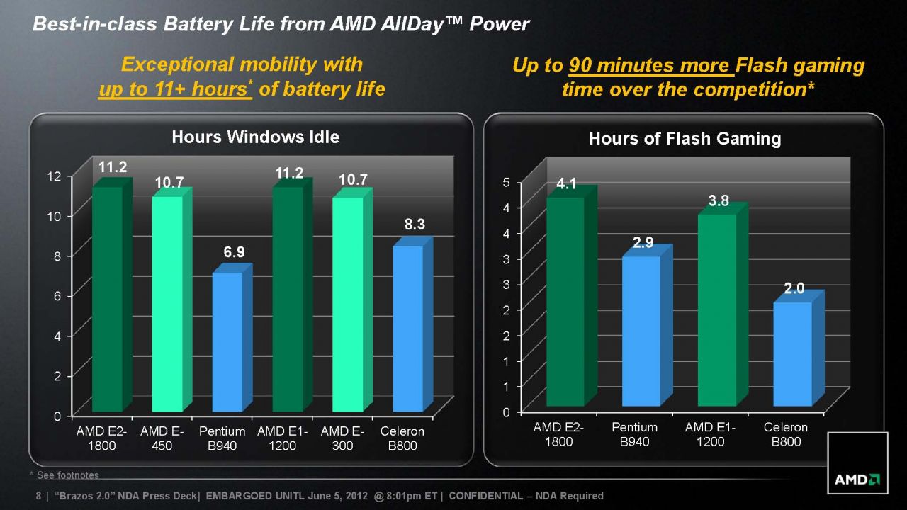 According to AMD, the E1-1200 can deliver up to 11 hours of Windows idle-state battery life and up to 90 minutes more web browsing time with 62.5 W-hr battery pack. However, this number is comparing the 18W E2-1800 against the 35W Pentium B940 that AMD is targeting the APU against.