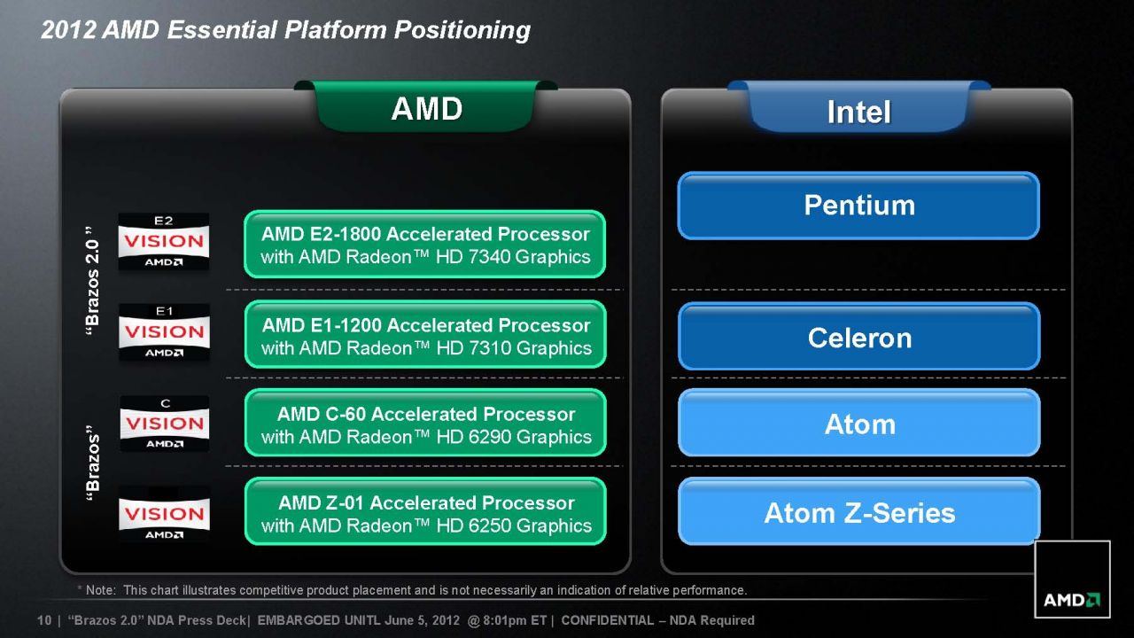 The Brazos was the first APU from AMD that is designed to compete against Intel Atom processor. However, the two models that AMD released today is aimed directly against some of the current generation Intel entry level processor. Specially, AMD is positioning the E2-1800 in direct competition against the current generation Intel Pentium processors (17W and 35W) that includes the Sandy Bridge. The E1-1200 is positioned to compete against the Intel Celeron CPUs.