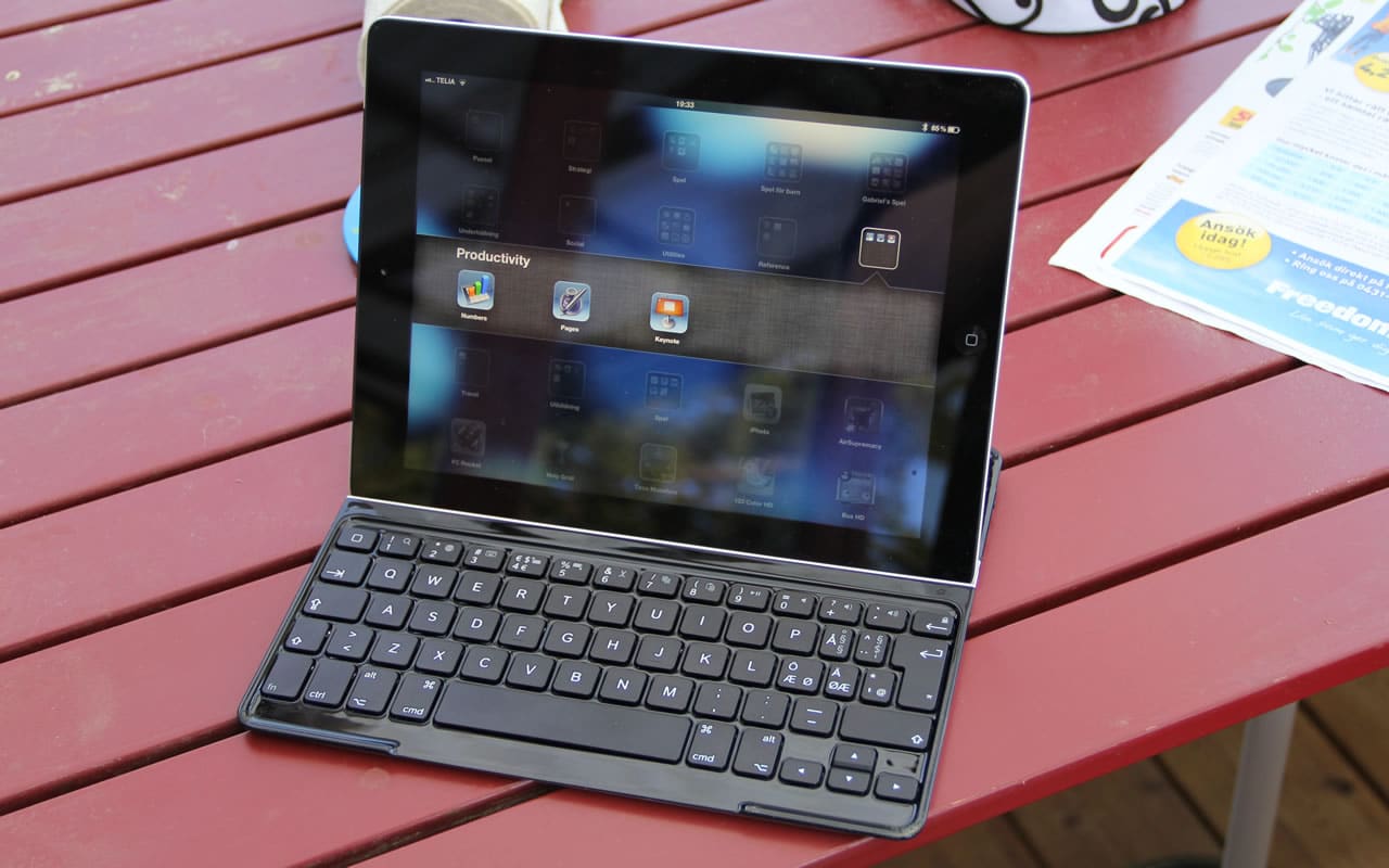 Since the cover needs to have the same dimensions as the iPad we do not get a full sized keyboard. We still get all the keys we need, even the Nordic special keys this reviewer needs, and if you look closely you also see that there are shortcuts on some keys for the iPad that can be reached via the fn-key. The keyboard cover does lack a track pad of any sort which means that you still will need to use touch on the iPad when changing apps, when you need to push a button etc.