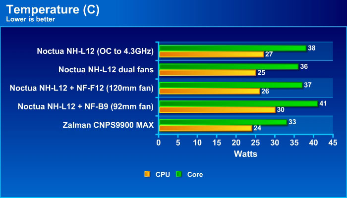 Knowing the size of the NH-L12 and the fact that it has only four heatpipes to conduct heat away from the base, we do not expect that it will take any performance titles. Taking this into consideration, the performance of the NH-L12 is quite respectable.