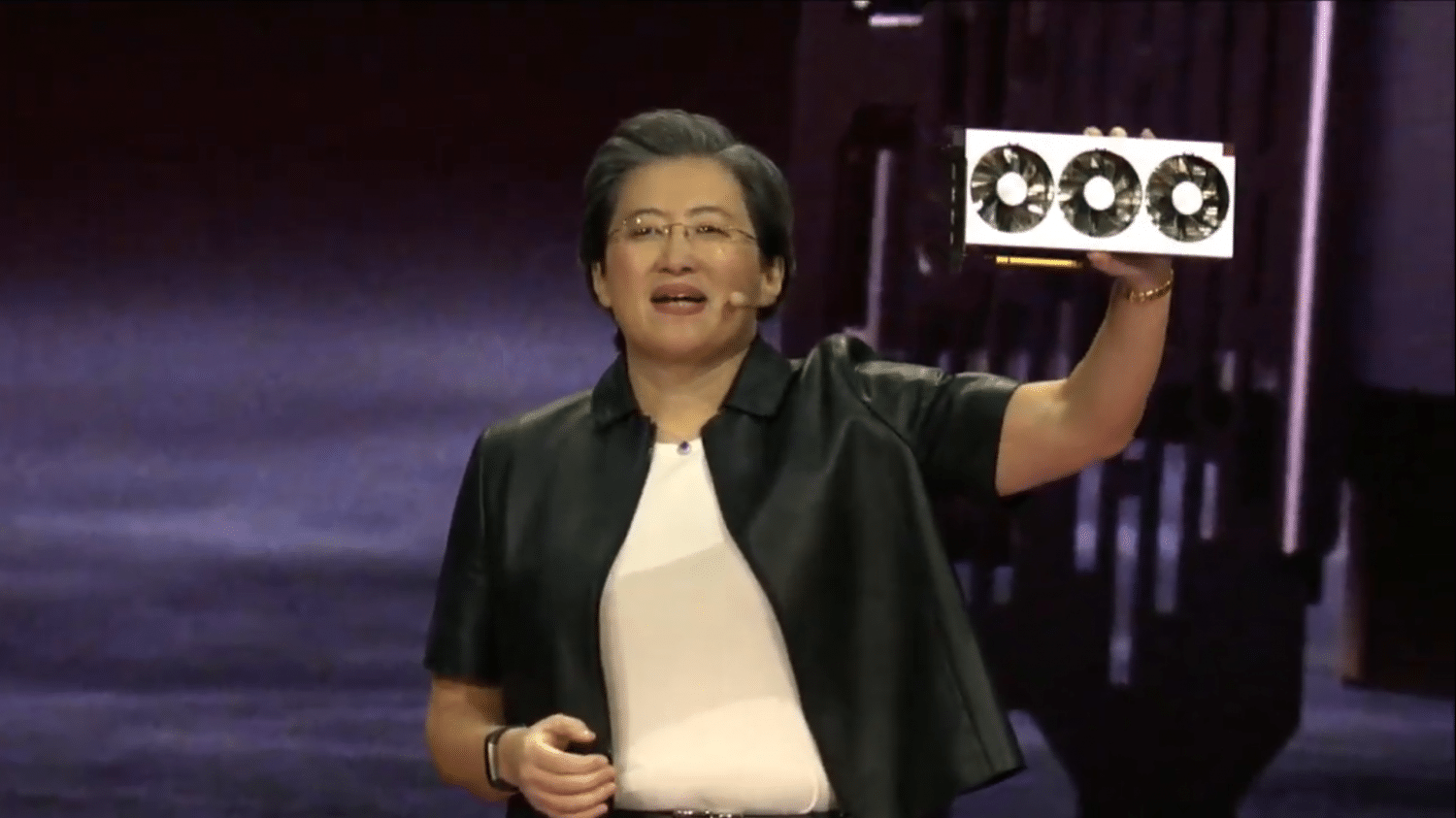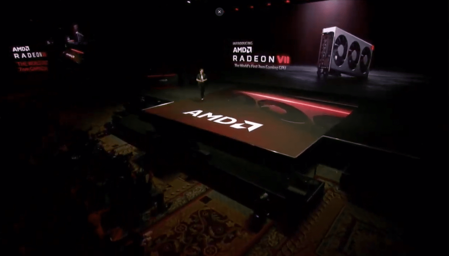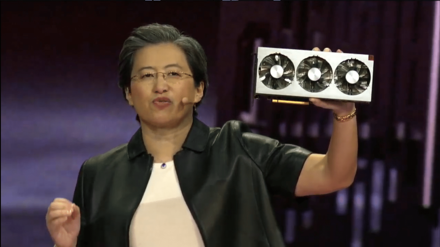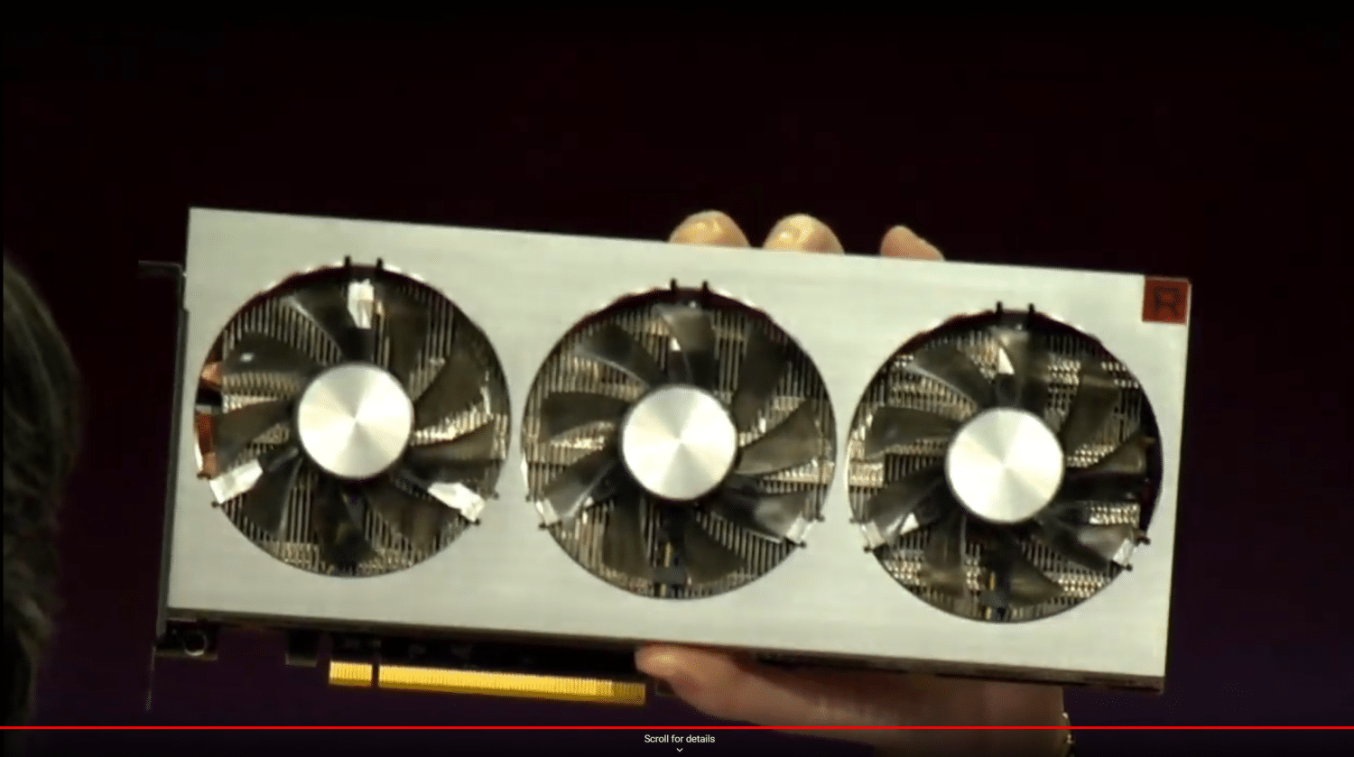 Then much like we come to expect Dr. Lisa Su (CEO of AMD) parades the new Radeon VII around the stage for everyone to take it in. The takeaways we get right away is that the card is cooled by triple axial fans and takes dual 8 pin PCIe power connectors.