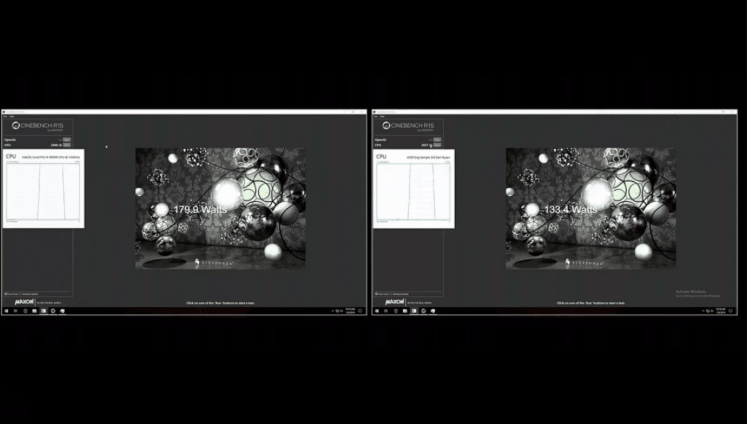 AMD Decided to go to their staple for proof of performance. Cinebench R15 which is a test I myself use among many tests for proof of performance. they ran the multi CPU test which was compared in a live run vs a 9900K platform. and the results were in lockstep with each other. The AMD part pulled a slightly higher score of 2057 vs the 9900K 2043 (or 2040) the screenshot was hard to tell. This when considering the variance between runs I have observed, this is within the margin for error. One thing that was impressive was that it showed a live power read for each platform and the test ended with the demo Zen 2 part pulling 133.4Watts while the 9900K was at 179.9Watts.