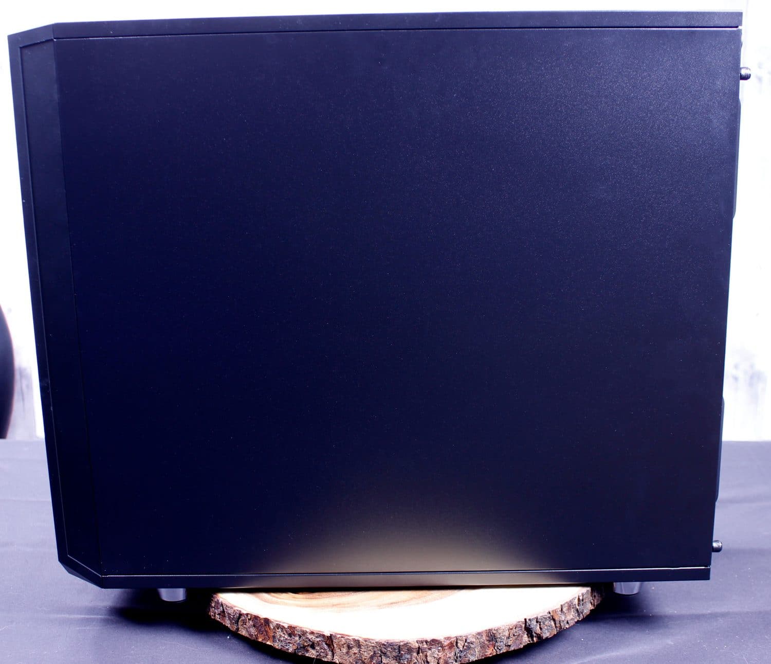 The side panel I quite like as it is a full glass panel with no thumbscrews or nuts on its surface. the side panels can be secured with thumbscrews in the standard rear position for security, but otherwise, on the trailing edge they use a ball and socket retention. these have a solid clunk when pressed closed and had me plenty confident that it would retain the panel. the front has a U channel which pivots on the rounded front edge so that the panel swings out and off the ball and socket like a car door.