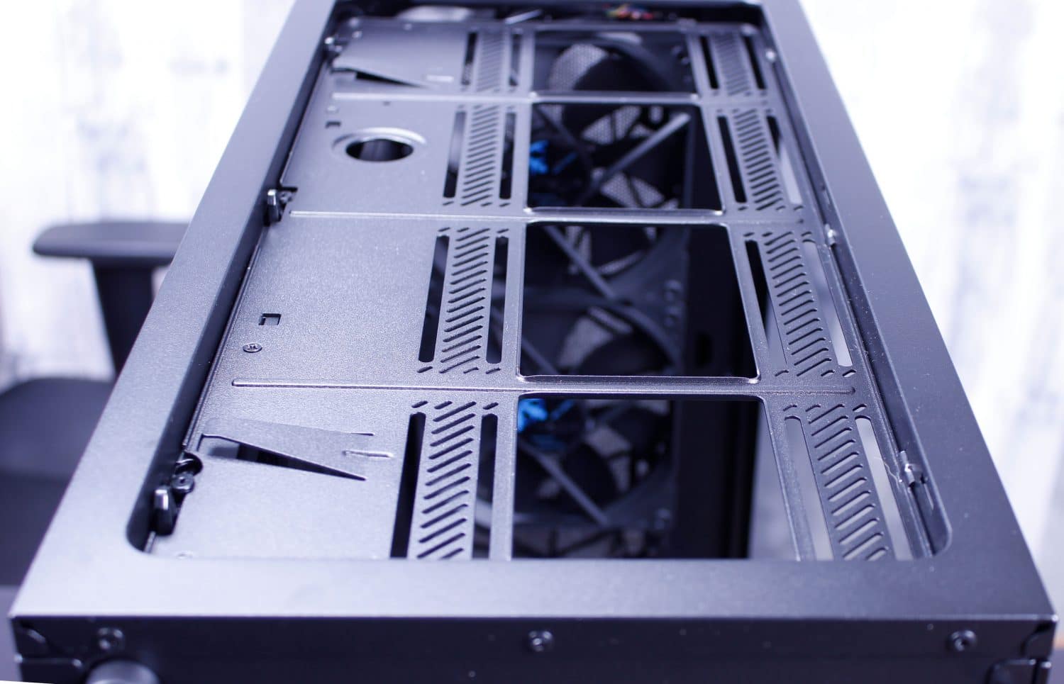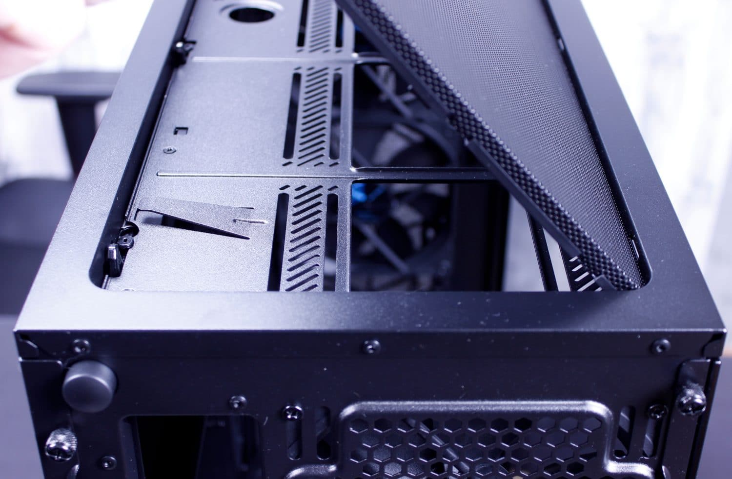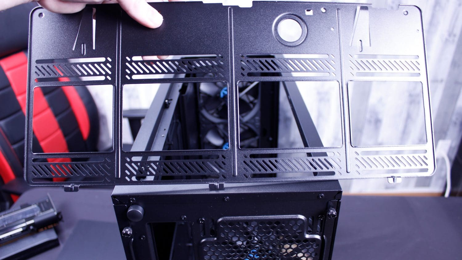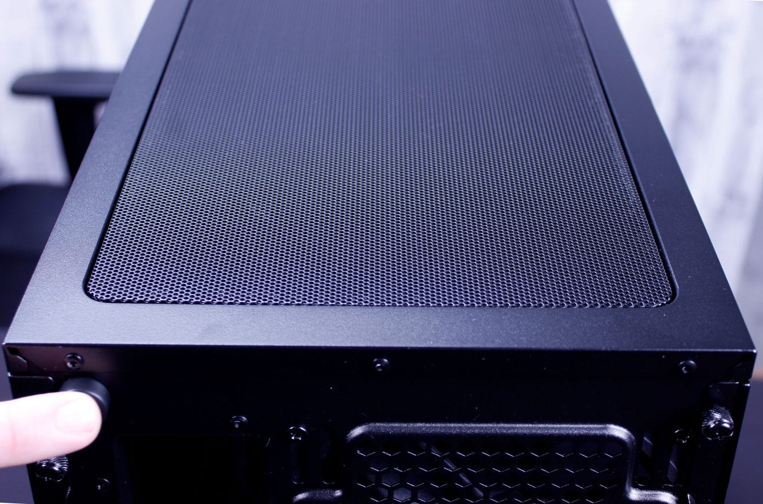 Here you can see the Meshify S2 top filter mesh which is the exact same release type as the Moduvent on the R6. I actually kinda wish my R6 came with this mesh top as I like it a lot and doesn’t have the gap my Moduvent has with the solid portion removed. Next up after removing the filtered top, we find the removable fan/radiator tray. This can be removed with 4 screws and lifts right out leaving a massive hole. A quick tip, if you are building in this case and not planning to install a top mount radiator, still remove these parts during the build as it means you have much more wide open access to installing parts in the chassis.