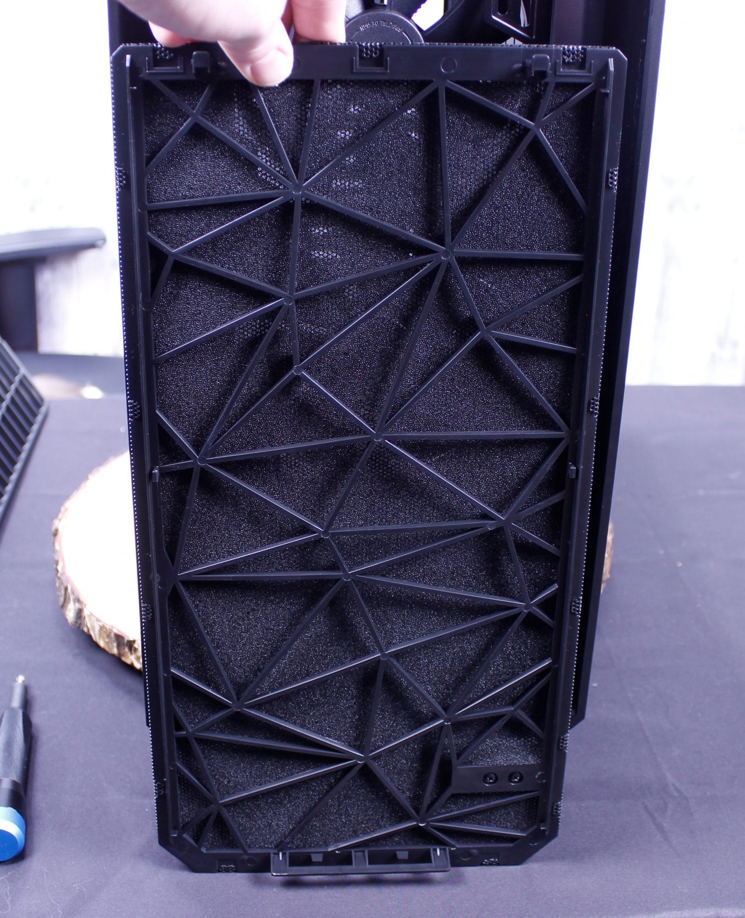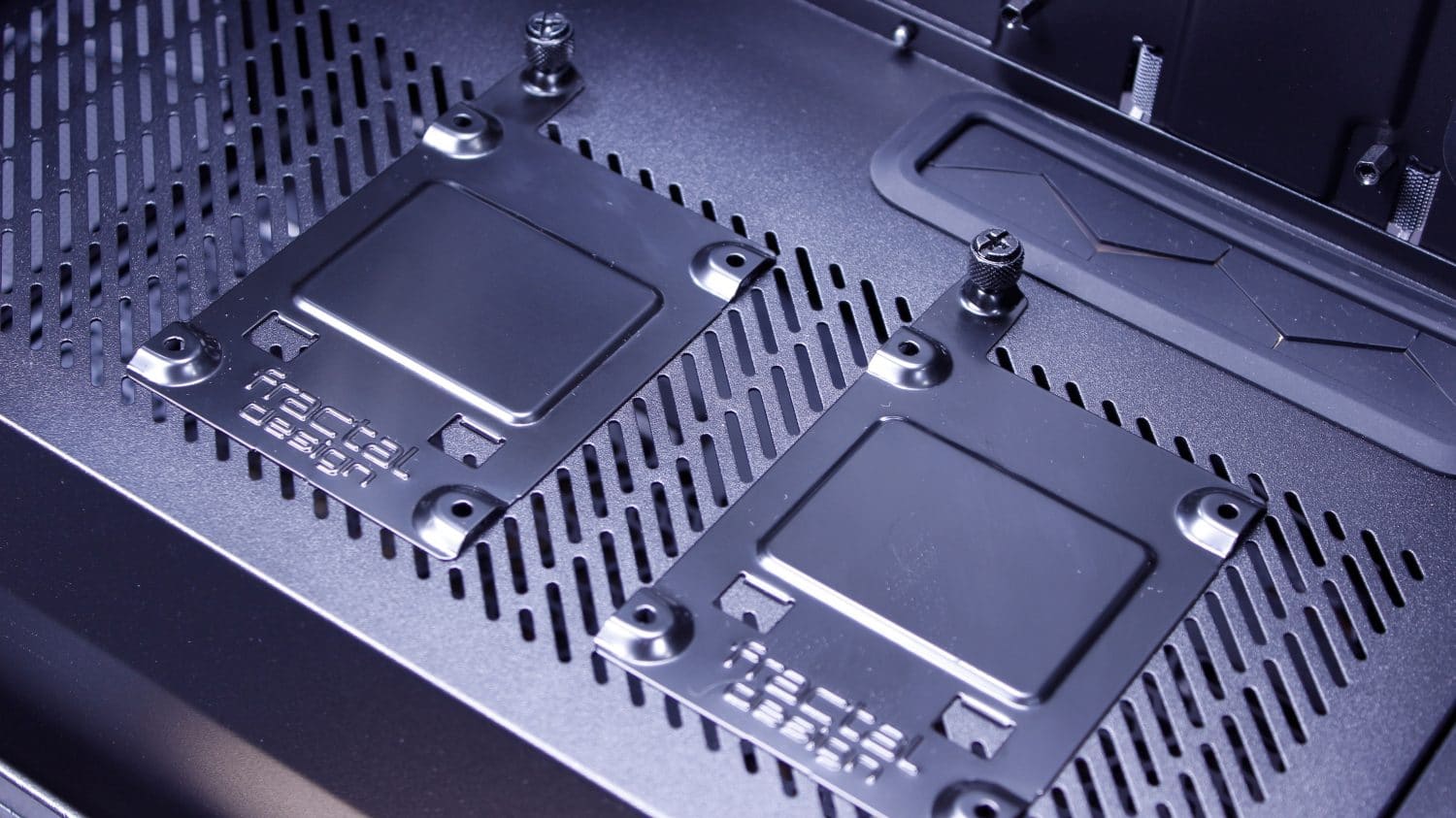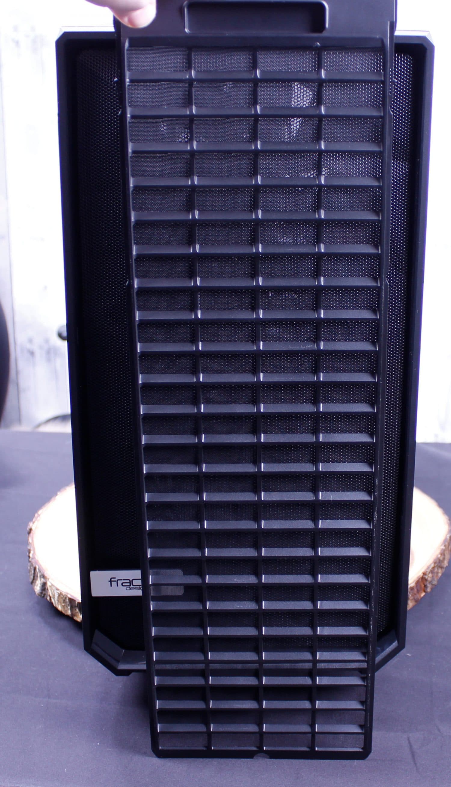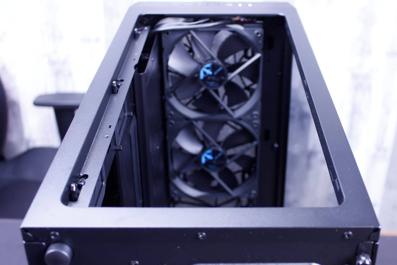 Here you can see the Meshify S2 top filter mesh which is the exact same release type as the Moduvent on the R6. I actually kinda wish my R6 came with this mesh top as I like it a lot and doesn’t have the gap my Moduvent has with the solid portion removed. Next up after removing the filtered top, we find the removable fan/radiator tray. This can be removed with 4 screws and lifts right out leaving a massive hole. A quick tip, if you are building in this case and not planning to install a top mount radiator, still remove these parts during the build as it means you have much more wide open access to installing parts in the chassis.