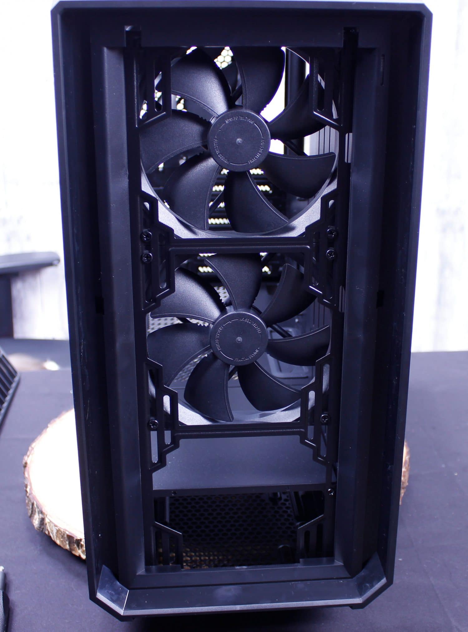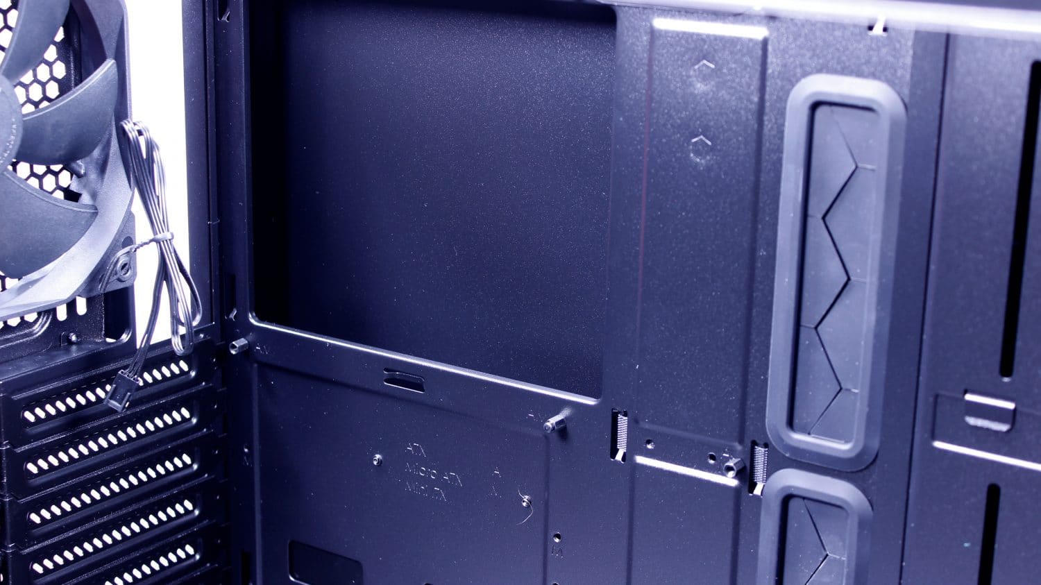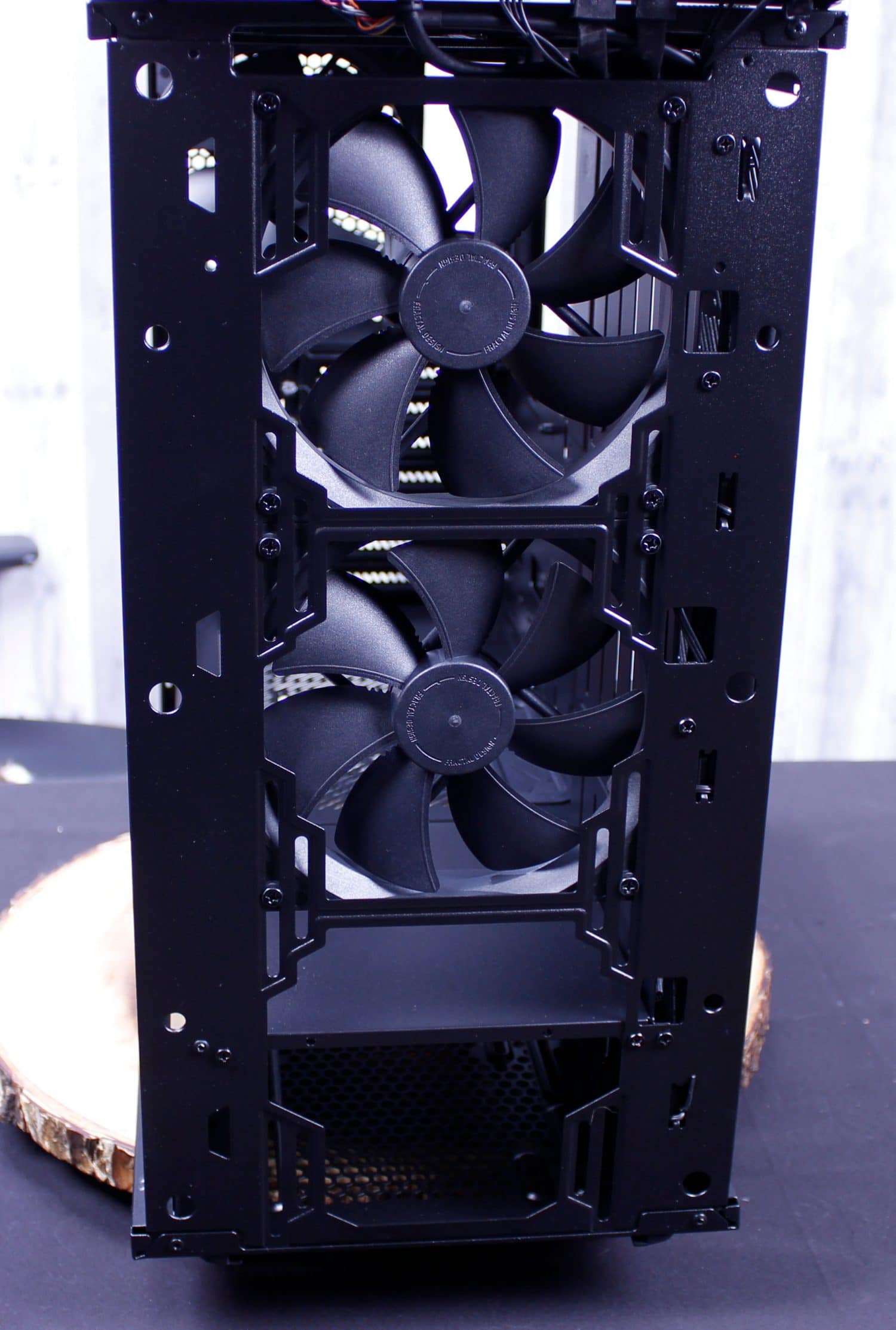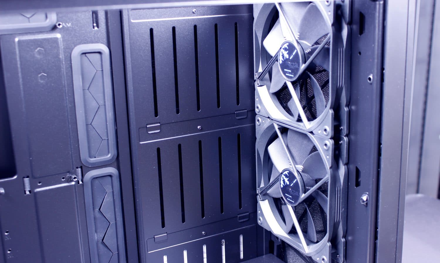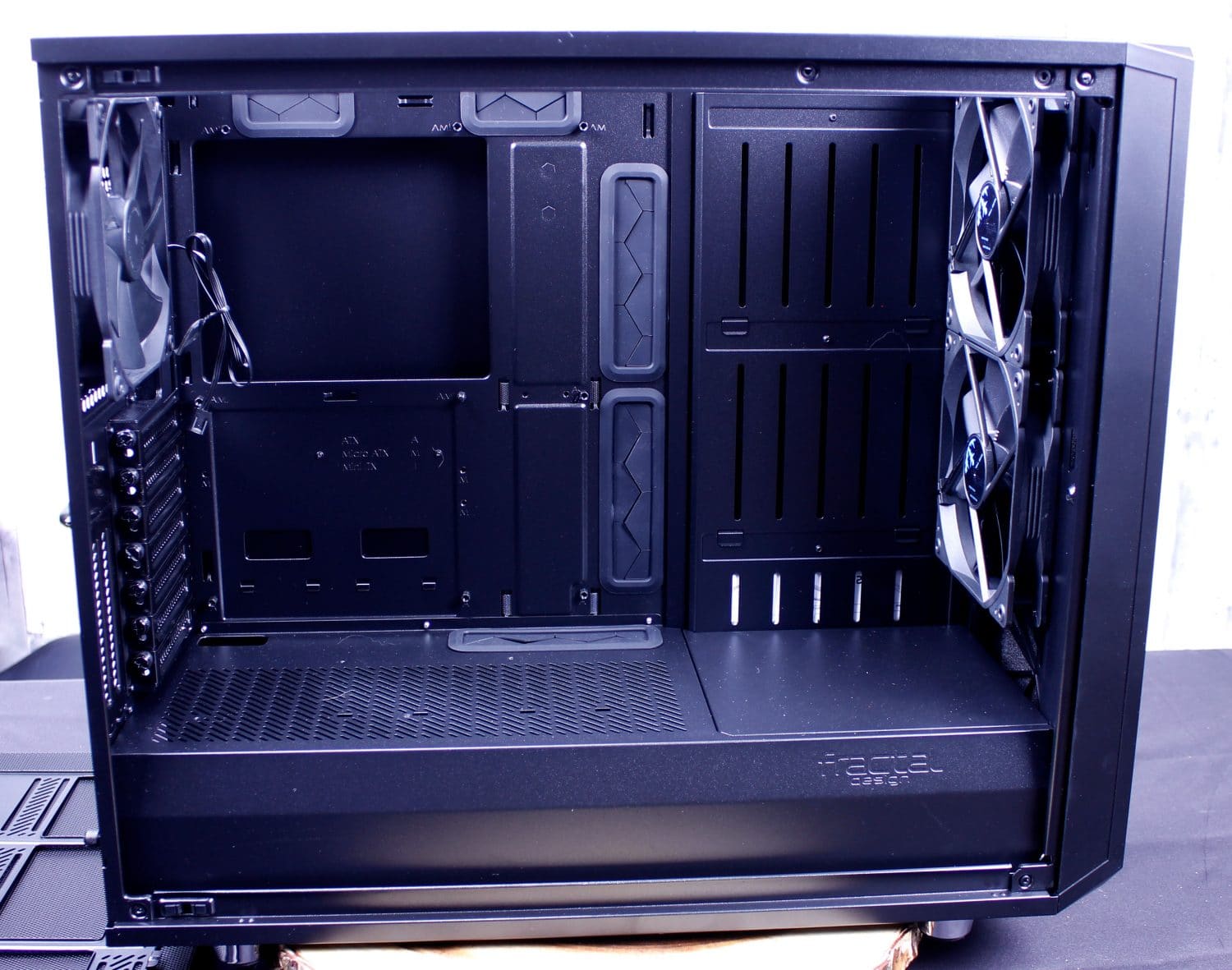 Here we have the interior of the bare chassis. the vertical slits are meant to be used for the included reservoir brackets. This case was definitely meant for liquid cooling enthusiasts and that makes me happy as its a high airflow concept case with plenty of room to build what you want. The front comes with dual 140mm fans while the rear sports a single by default.