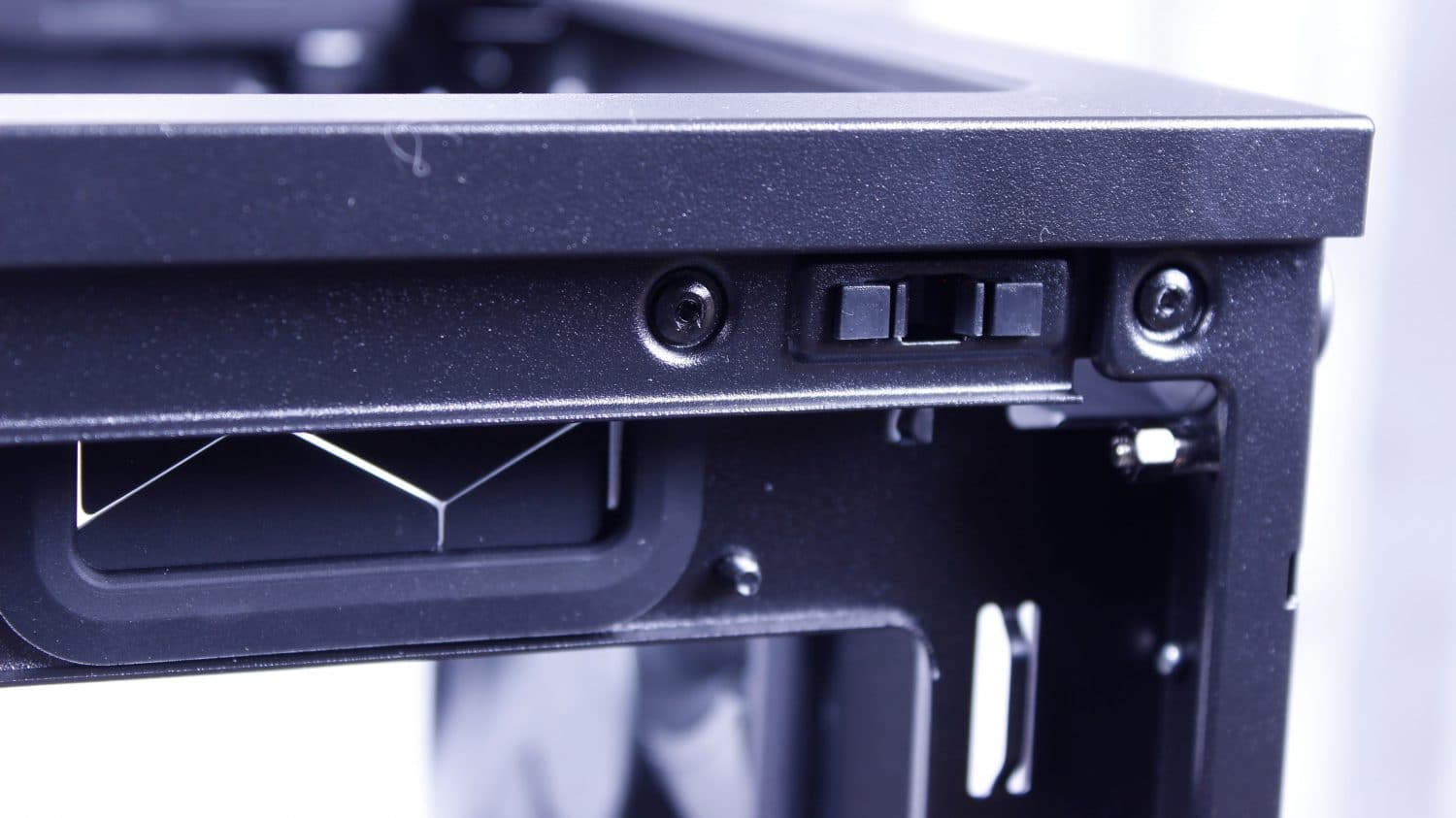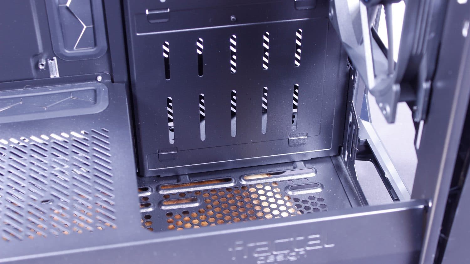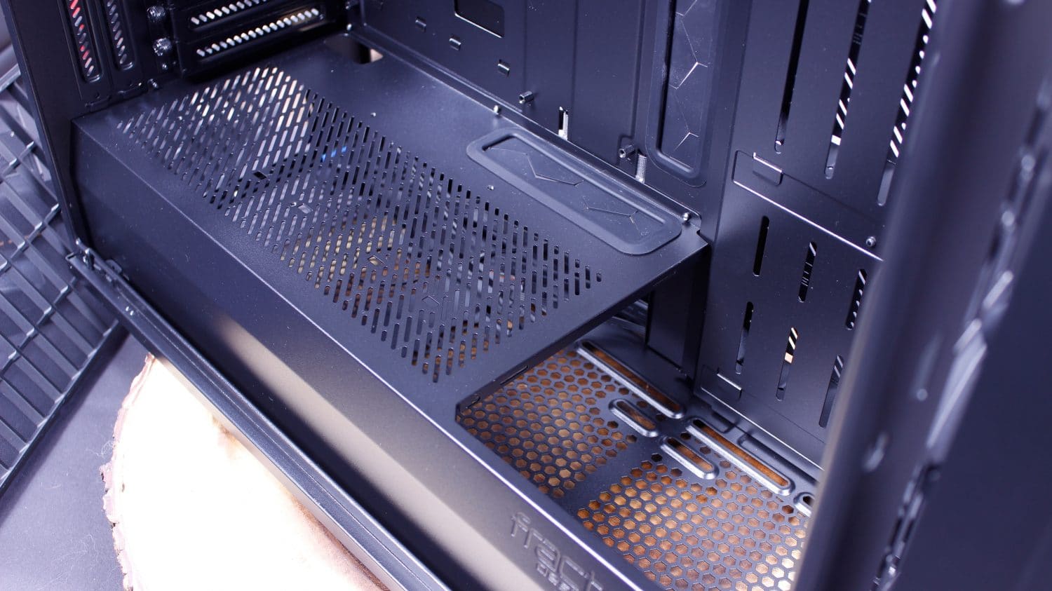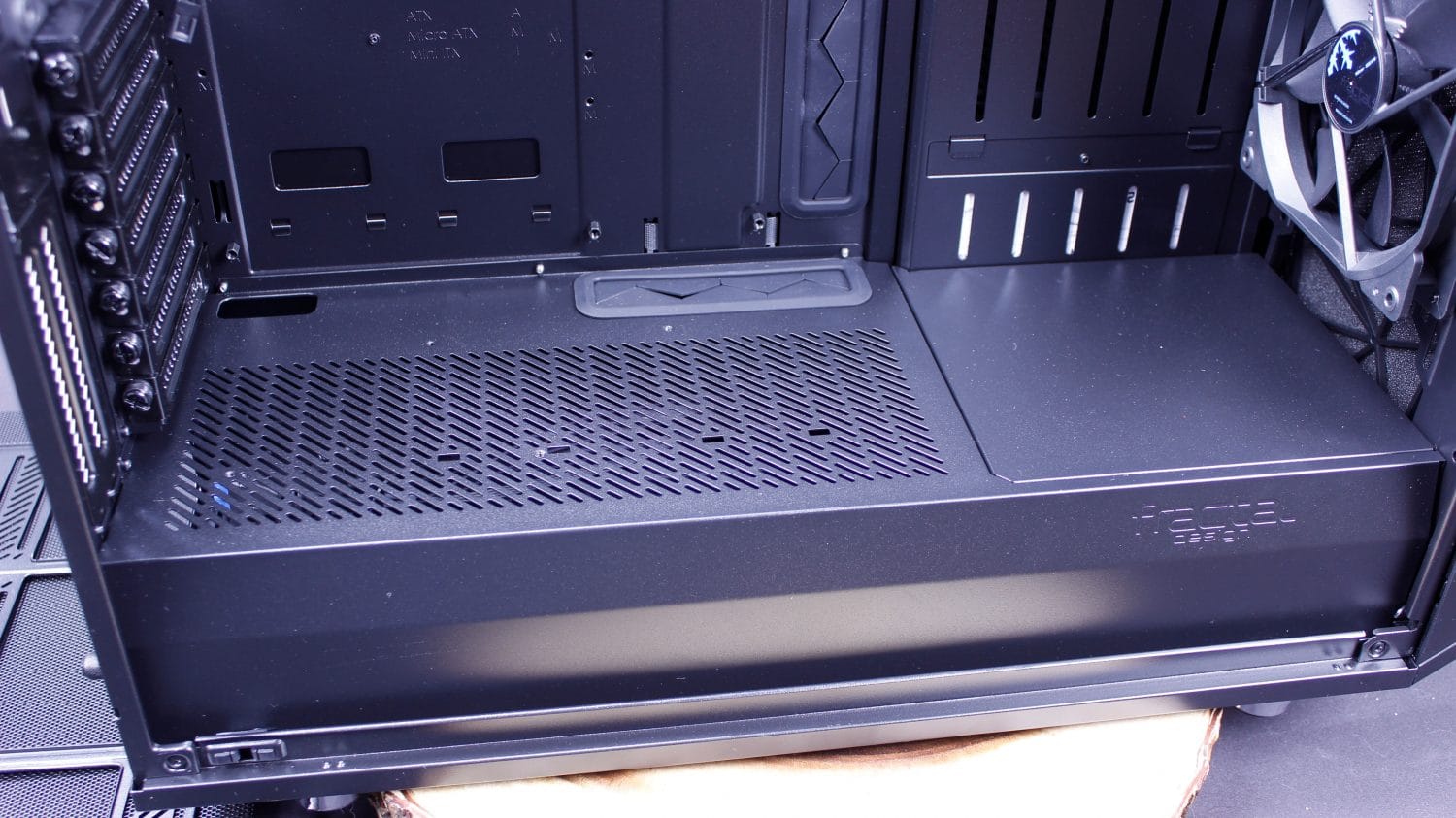 Here you can see the front area of the PSU shroud which can be removed with two screws. The two screws are accessed after removing the front panel. this area allows access to the lower under PSU shroud area where Fractal says you can also install up to two fans or even a 280mm radiator, although the access to this area is limited and installing fans down here seems a little strange as without the panel removed you would just be ventilating the PSU shroud area.