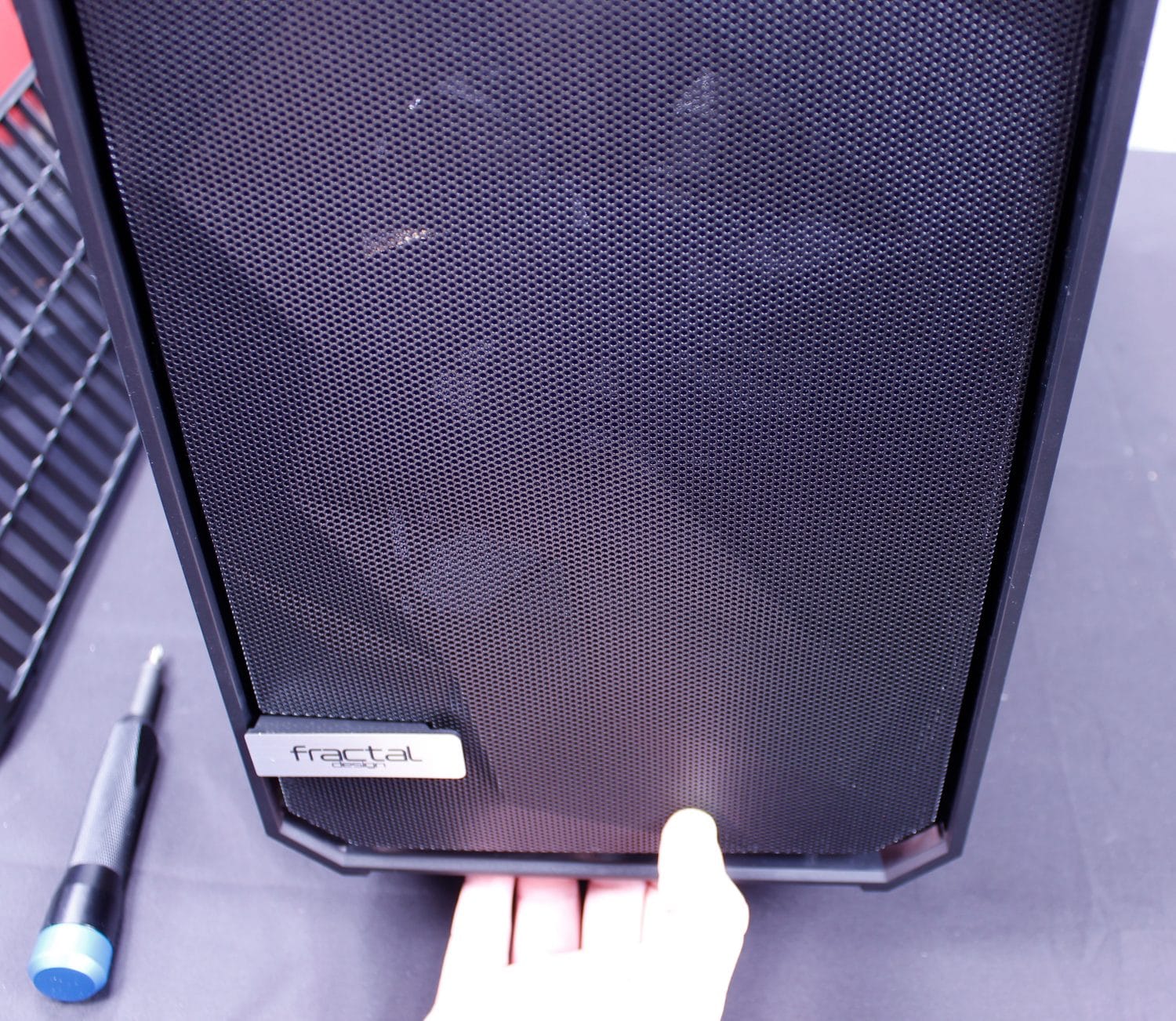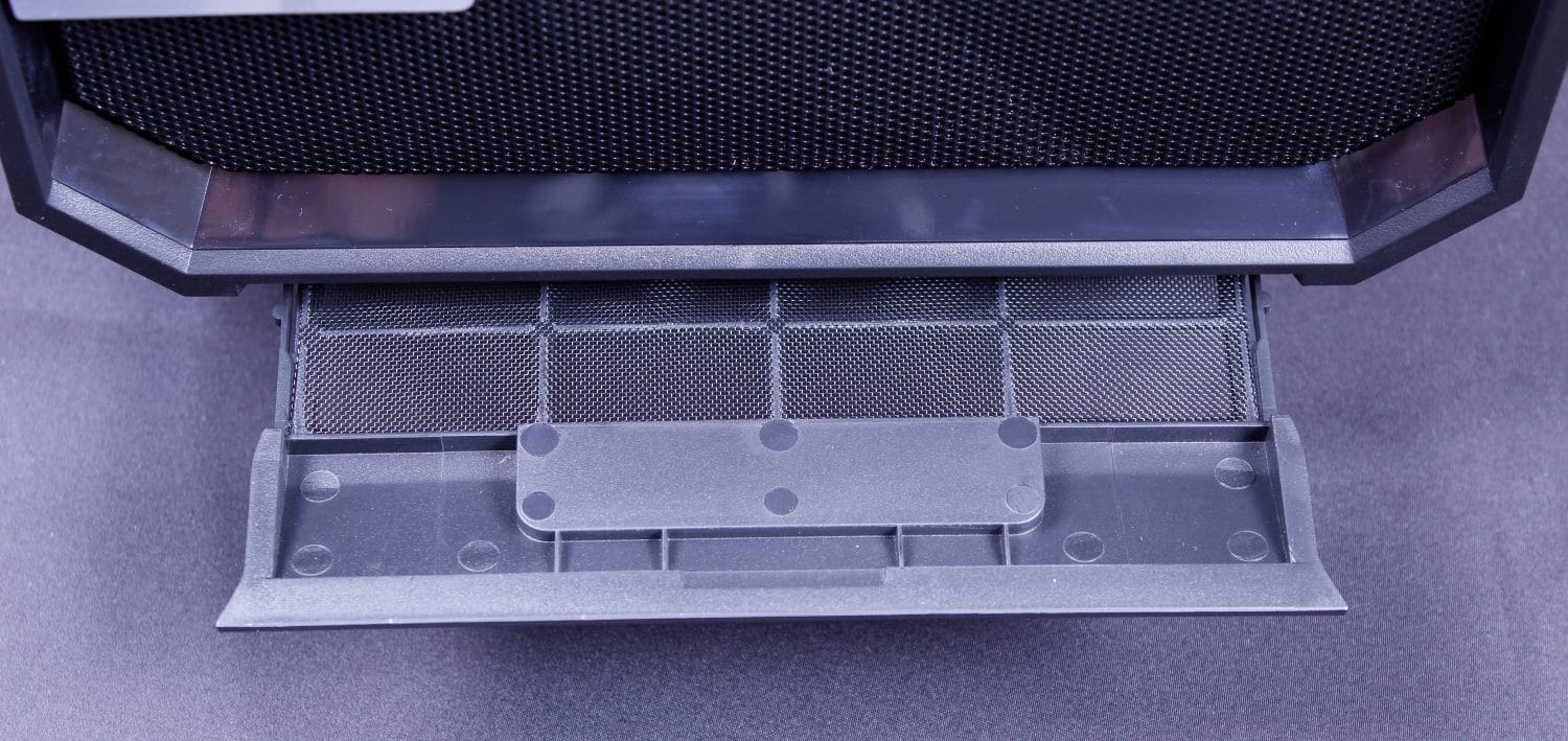Here we see the front of the chassis and while unassuming it does hold some cool stuff. First off if you reach under the front you will find the full-length slide out dust filter. Once the dust filter is removed you can then reach under the front panel and locate the clip that releases the front mesh. After this, you reach to the bottom again and with a firm pull, you can release the clips holding the front frame off to see the complete front metal of the chassis. You will notice in the image just out of frame I am holding the front panel up and how little slack there is to move the front panel without removing all of the cabling.