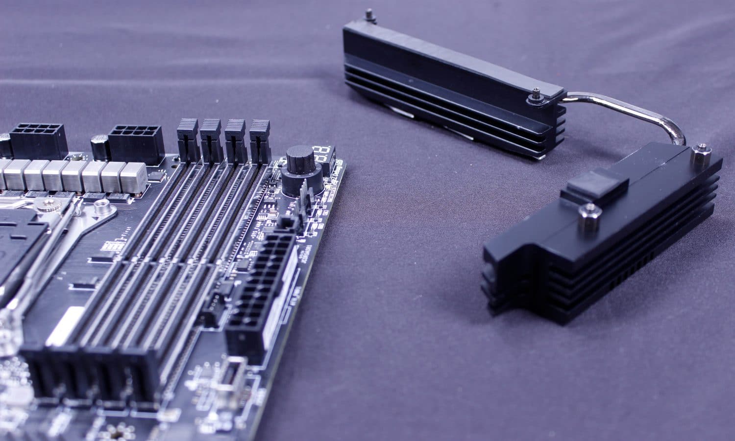 First part to get the ax was the lower M.2 Frozr plates which attach to the PCH sink with screws and have a thermal pad for each M.2 drive sitting in the slots below.