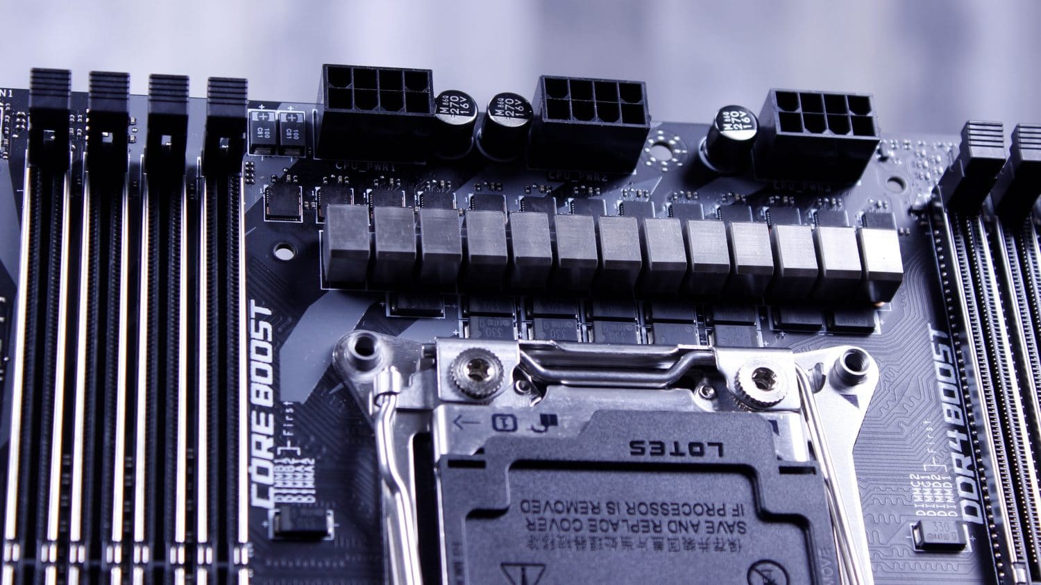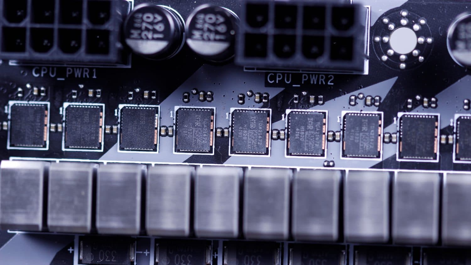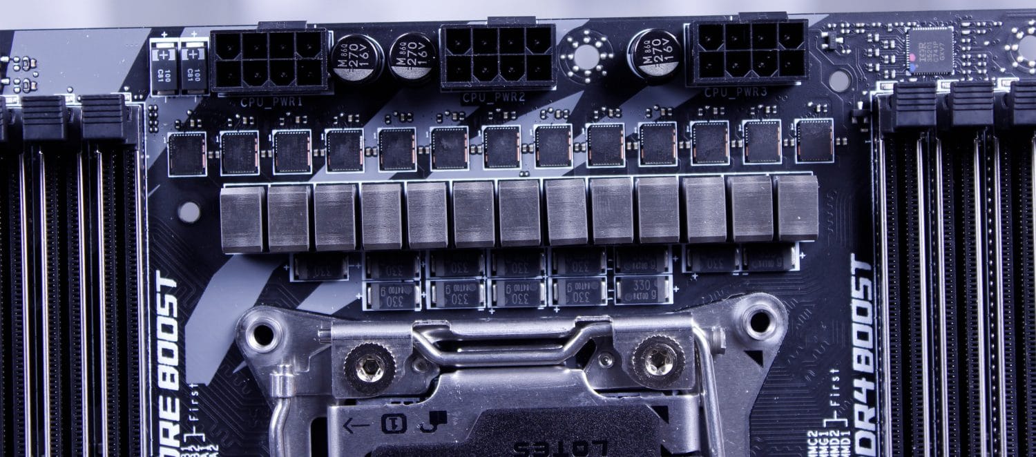 Here we get a peek at the VRM and what its made up of. The Main power stages for the CPU are TDA21472 which are 70A units. They are controlled by an International Rectifier IR 35201 which is an up to 8 phase controller. I think it goes without saying that this VRM is far sufficient for even heavily loaded 18C CPUs.