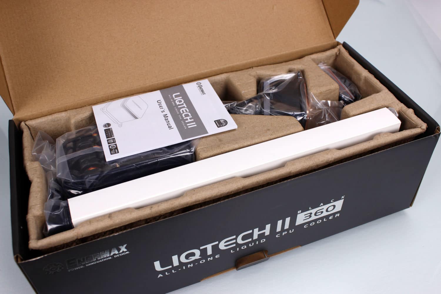 Here is the Liqtech II 360mm, unboxed and pretty much ready to mount.as you can see the only permanently affixed cable is the pump cable, with all of the other ancillary components being added onto the unit.