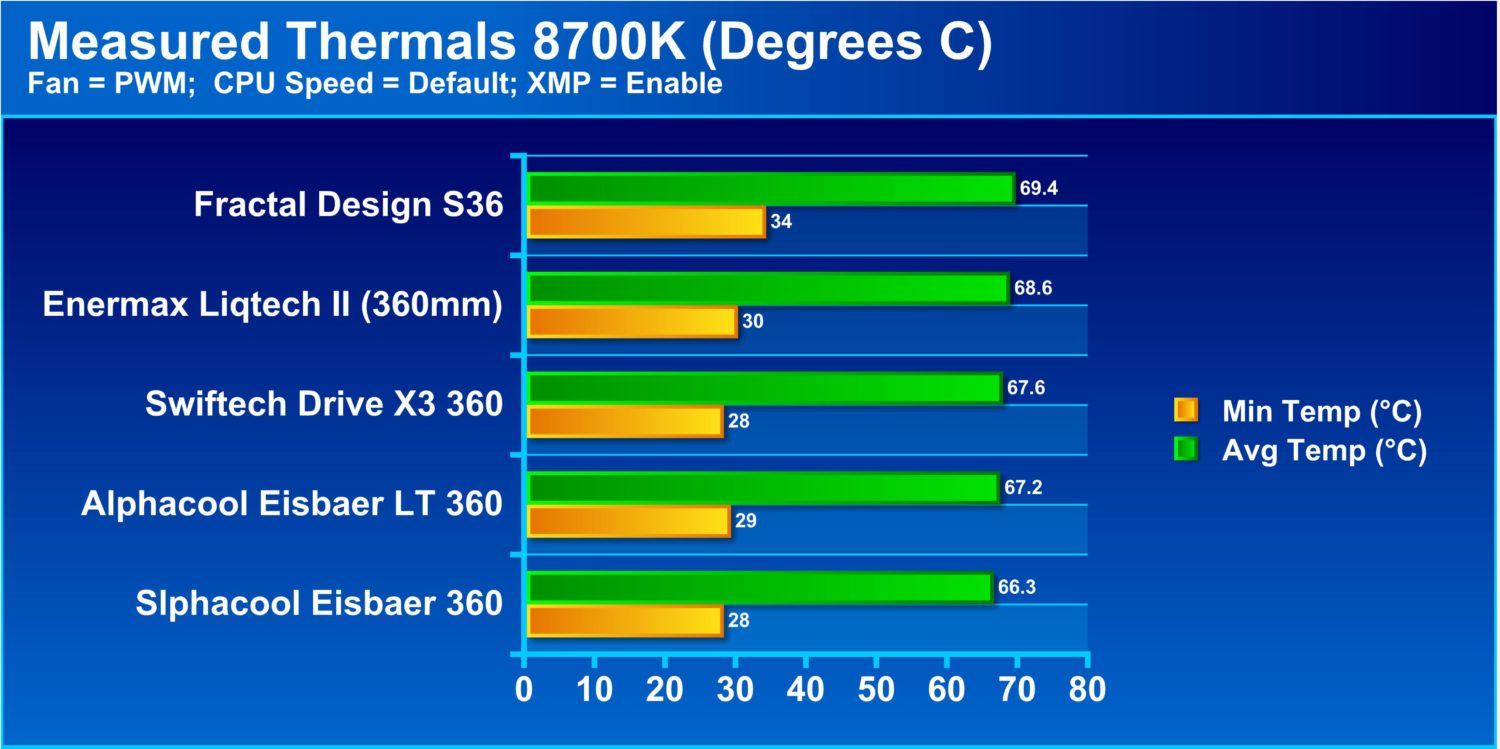 Here we now have the much more tame 8700K which is indicative of a very popular mainstream platform load. The Liqtech II did a solid job here as well but the AIO solutions form the bigh boys in liquid cooling definitely took the front spot but only by marginal results in some cases by less than 1C. The Liqtech II did rather well and readily beat the Asetek based Fractal S36 cooler.