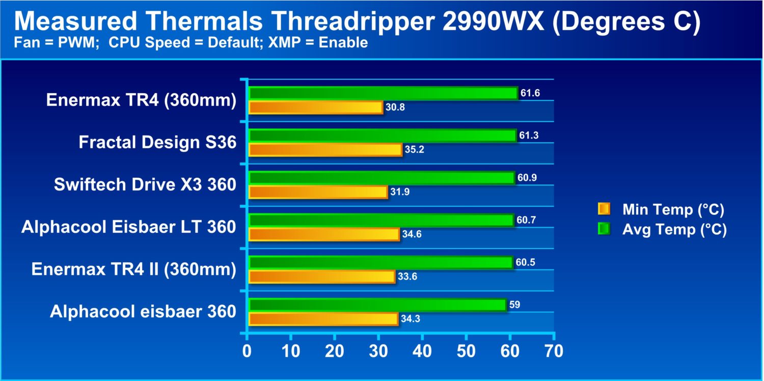 First up is the monster of the group, the 32-core Threadripper 2990WX. this chip tips the scales gulping up to 250W power under its standard configuration. Therefore we felt it was the aptest load for these high-end coolers. Do note that we do have a 2950X as well but well, what fun is that when you have something like the 2990WX to put through its collective paces? Needless to say, while the chip overall can get rather toasty, the liquid coolers in this test all managed it well and even the non-full cover IHS solutions did an admirable job with the new model Liqtech taking an almost chart-topper with only one of the Eisbaer units from Alphacool barely beating it out.
