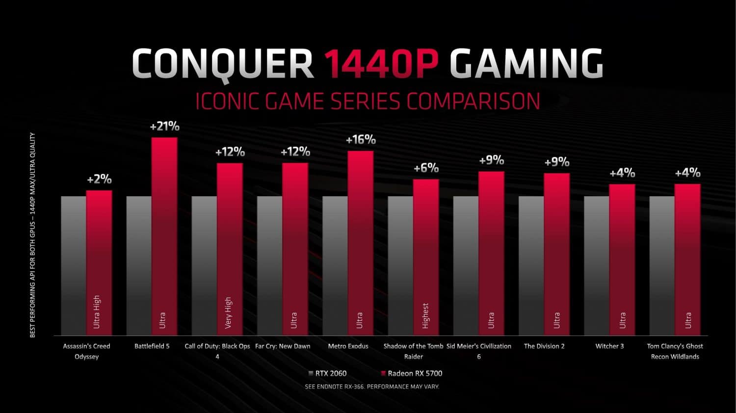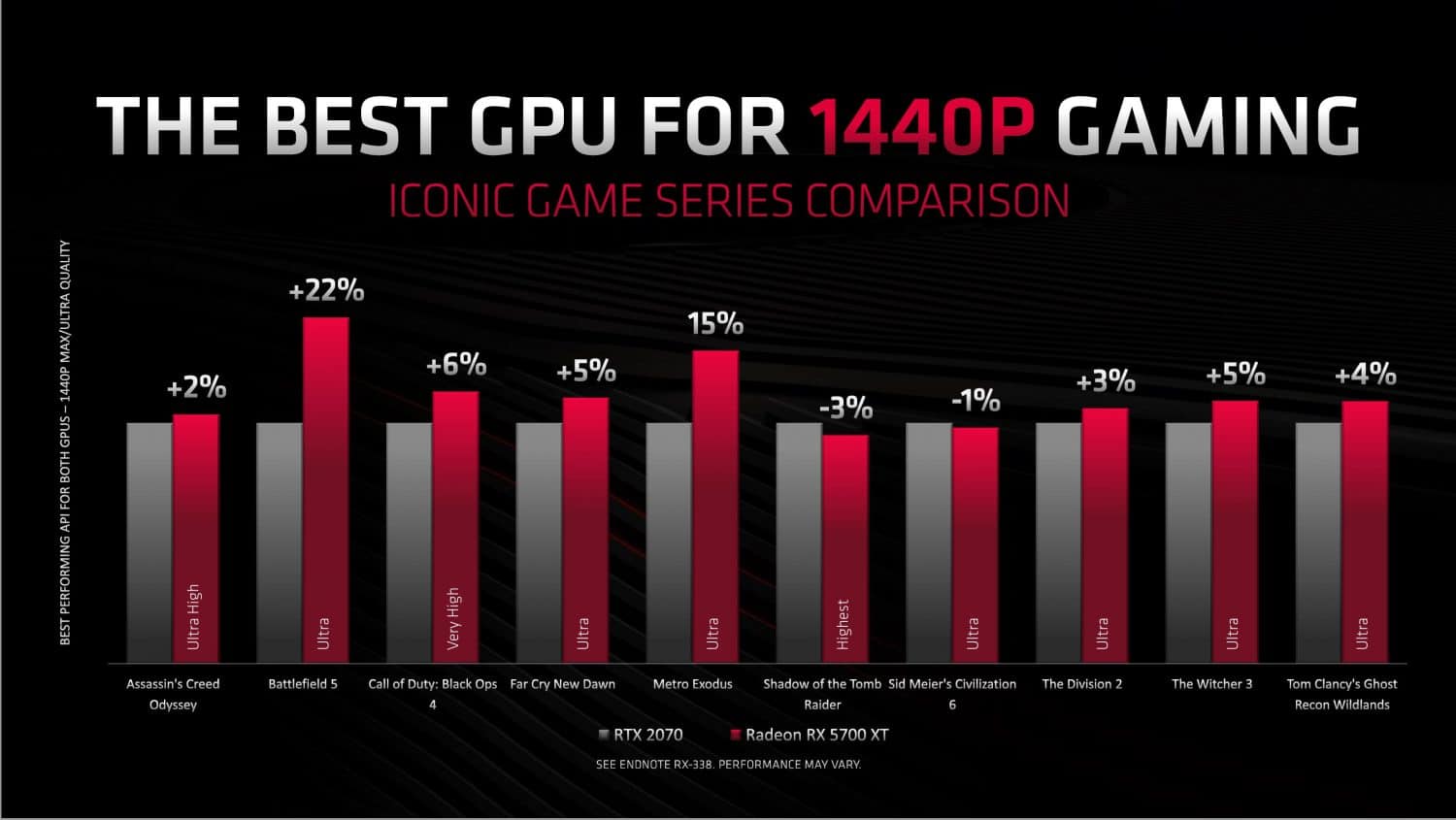 The RX 5700 NON-XT model is a similar GPU die but with 36 compute unit part with 2304 shaders. it also has 8GB GDDR6 onboard but clock rates are lower here. The RX 5700 shows a ‘game’ clock of 1625MHz while the peak, burst or ‘boost’ clock slides up to 1725MHz. The performance shows is labeled ‘conquer 1440p gaming’ which now seems like the RX 5700 and the RX 5700 XT are fighting for the same place? I am confused but I digress, they compare the RX 5700 to an RTX 2060, and the numbers are fairly within margins of what I have seen, it is a clear cut performer.