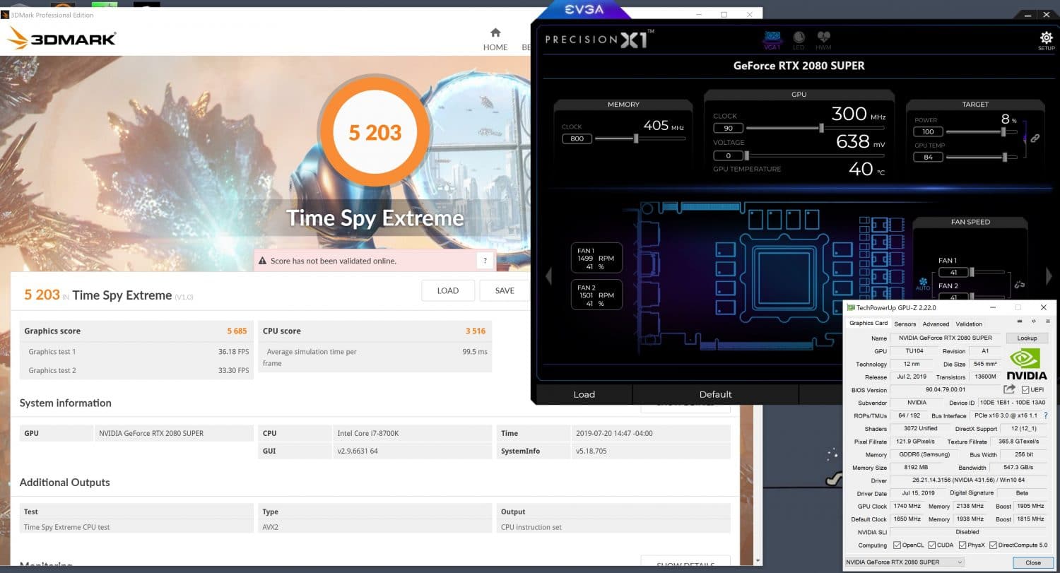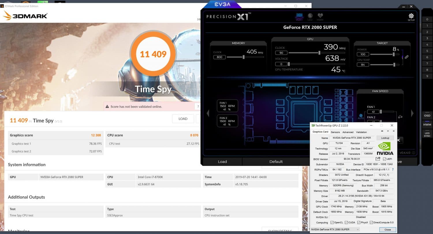 The memory default for the RTX 2080 SUPER is the fastest VRAM to be used on a GPU to date with a clock rate of 15.5Gbps. We were able to push the memory to +800 which raised our effective clock to 17.1Gbps.