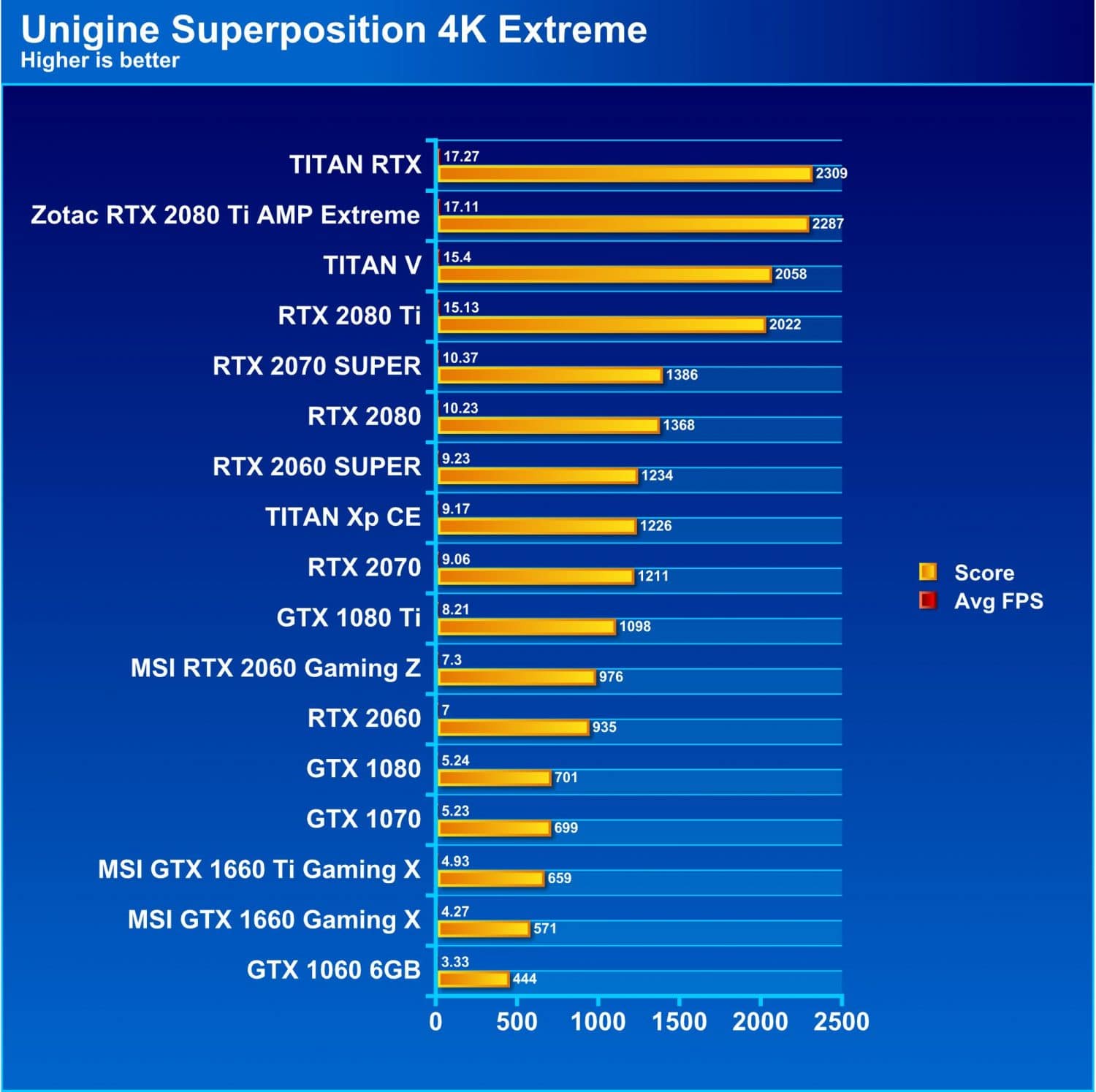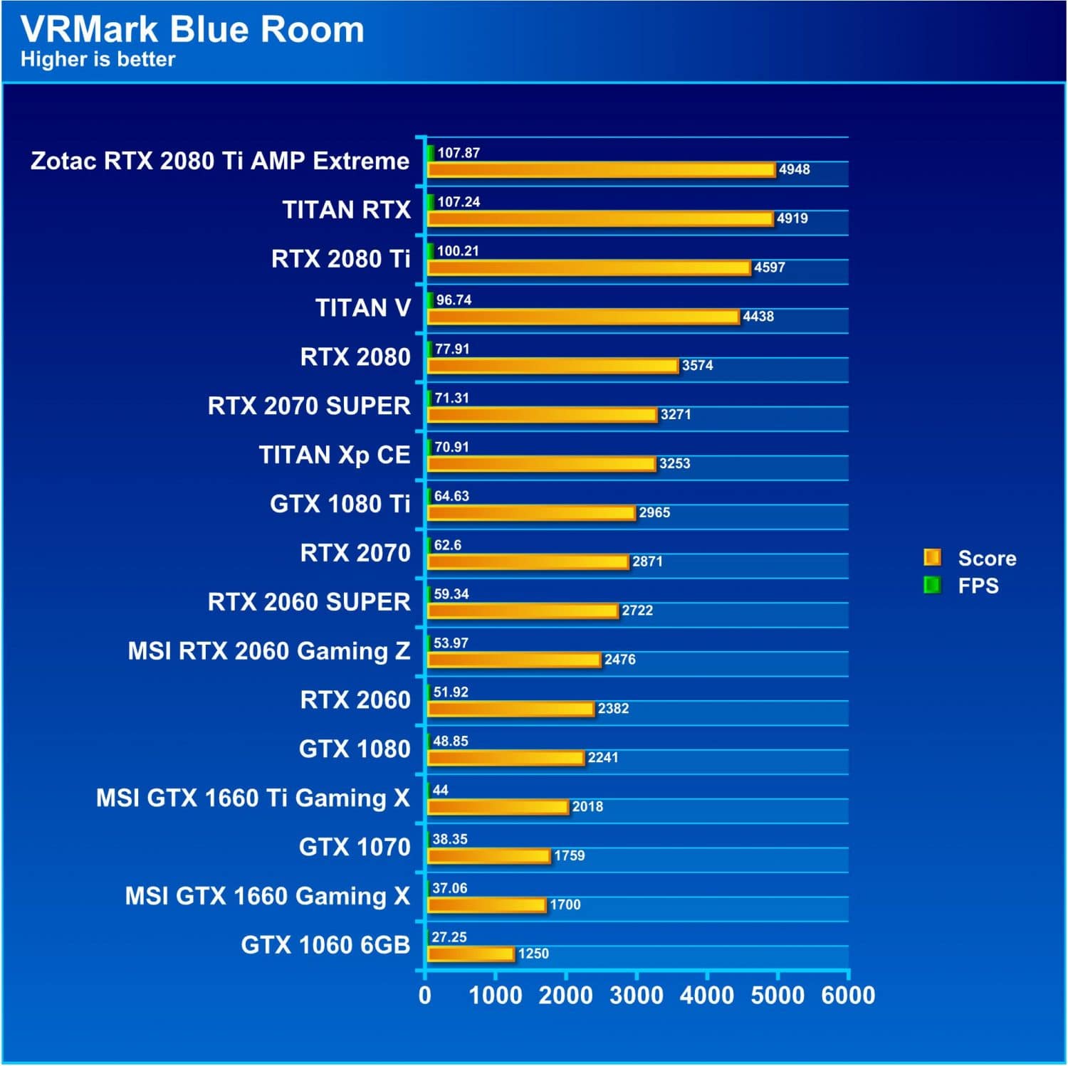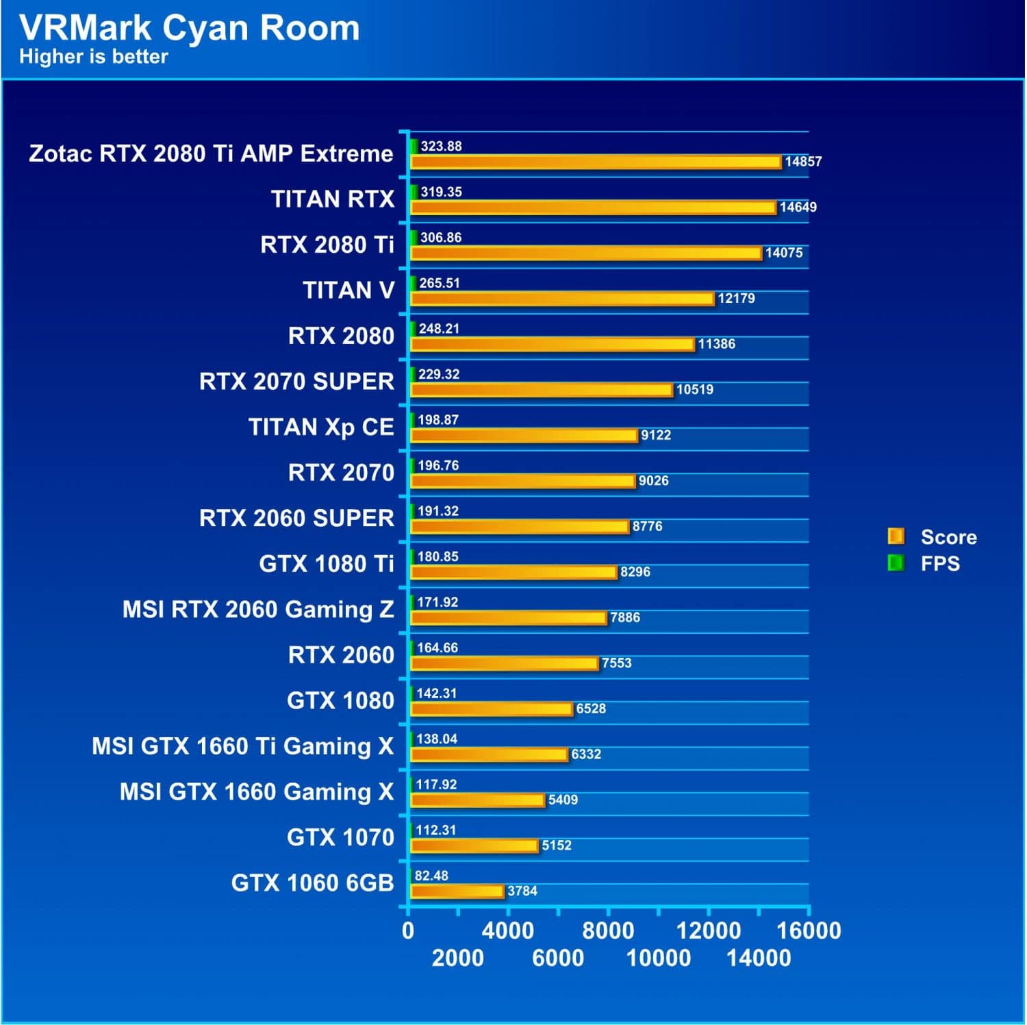 VRMark has 3 levels, Easiest being Orange, then heavy being Cyan and insane mode being Blue. We are omitting Orange as every current card maxes it out and it is no longer a very viable representation of performance.