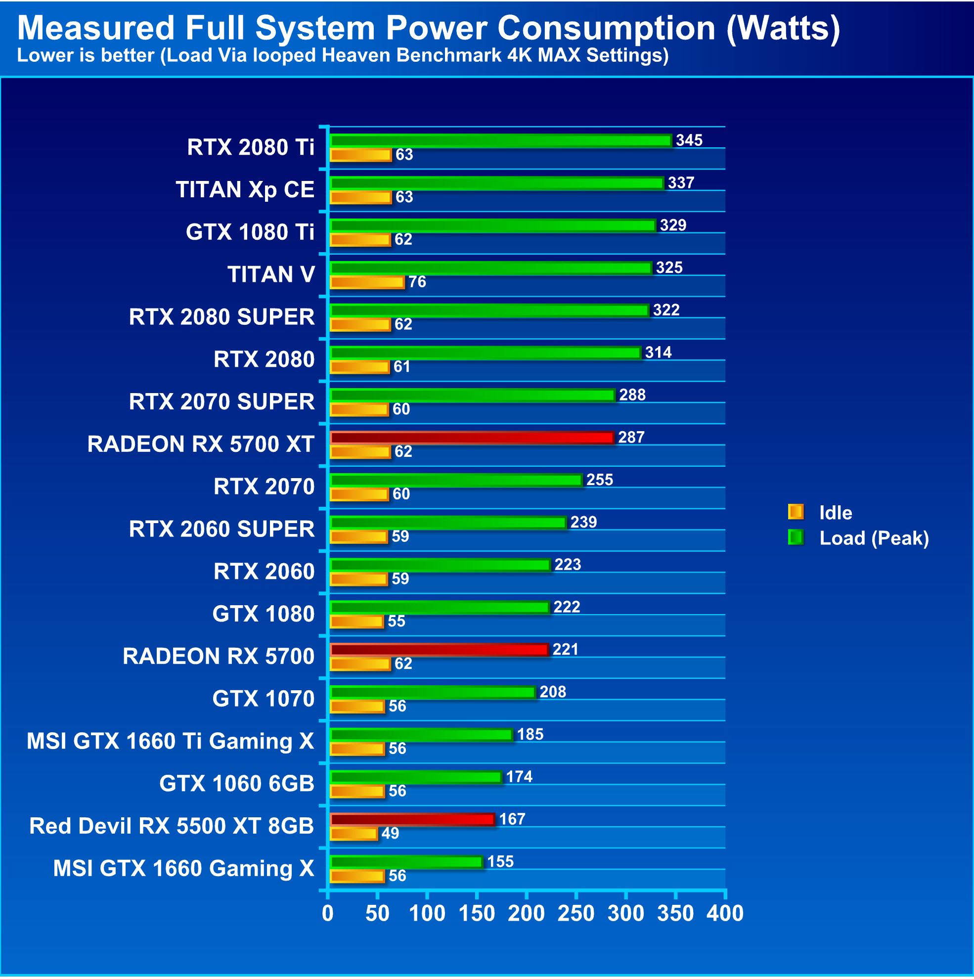 The power readings are interesting as the Red Dragon RX 5500 XT shows lower idle power draw than we have ever seen to date on our testbench but its loaded jumps up to just north of the GTX 1660 edging closer to the GTX 1060 6GB card.