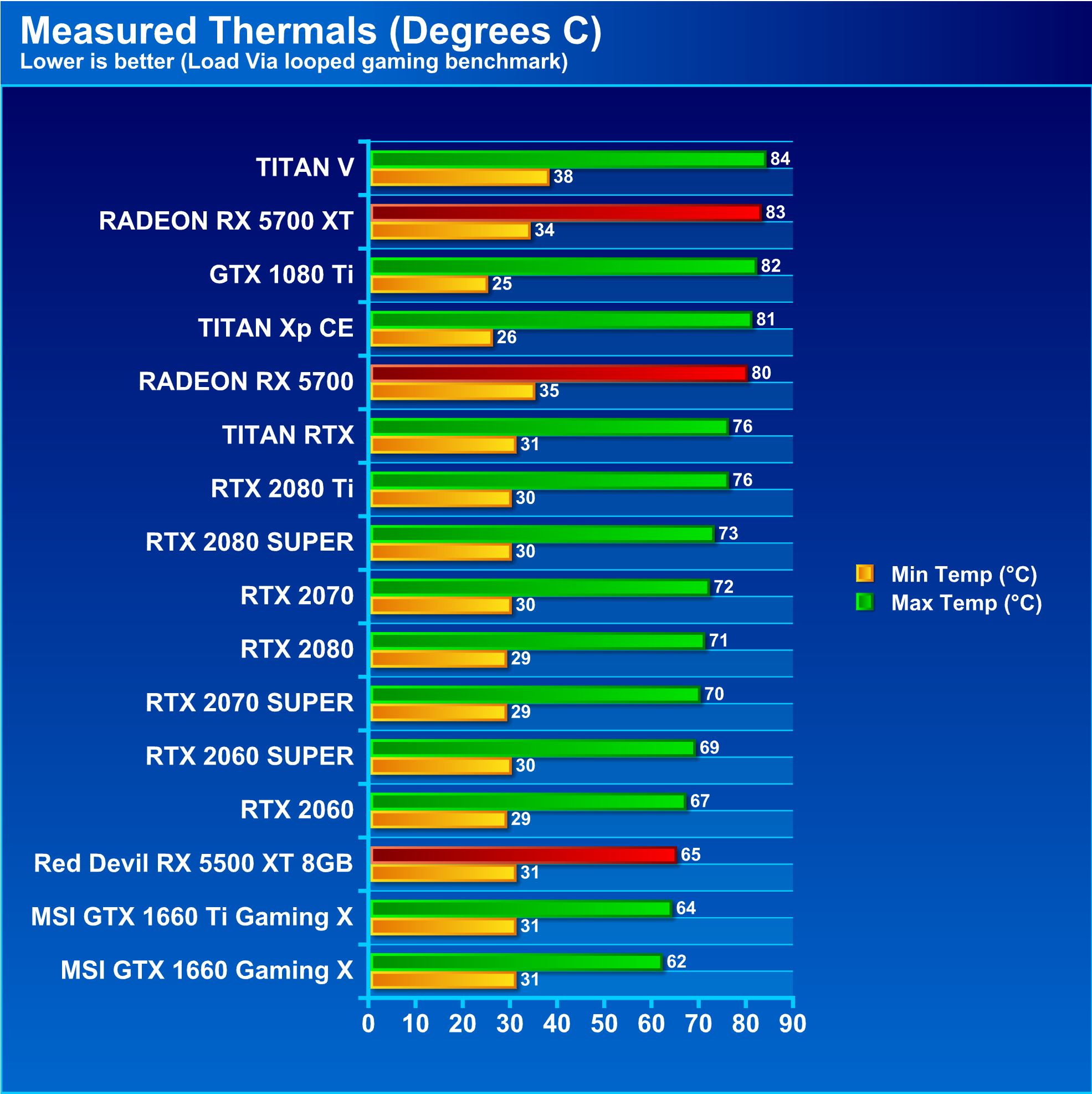 When testing the Radeon RX 5000 series Navi cards we always observe the junction temperature since the normal reported GPU or edge thermal can be much lower than the temp that actually matters. From our testing, the Junction is the one referenced for the fan and boost algorithm and therefore is the most applicable for comparison. Here we see the thermals at idle on par with the lowest we have seen from Nvidia which are partner cards with competent coolers from MSI. Under load, we find the Red Dragon RX 5500 XT in between the RTX 2060 and the GTX 1660 Ti whcih is not a bad place to be and it did this without even stressing the cooling fans.