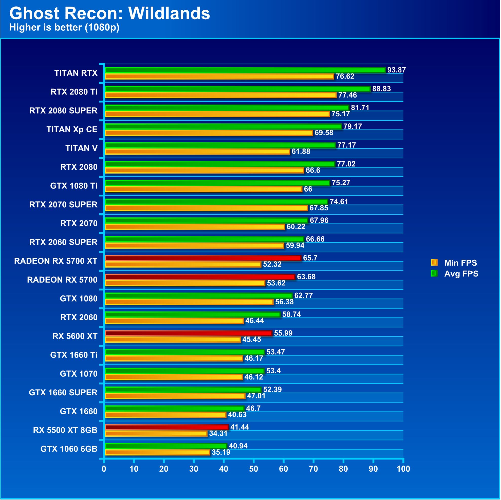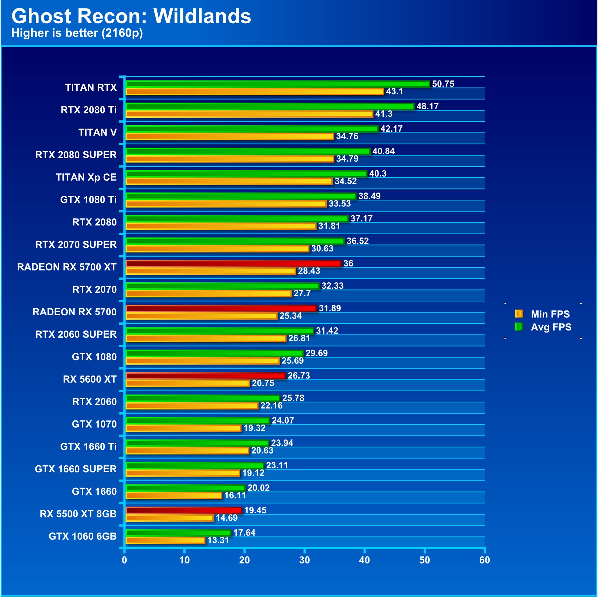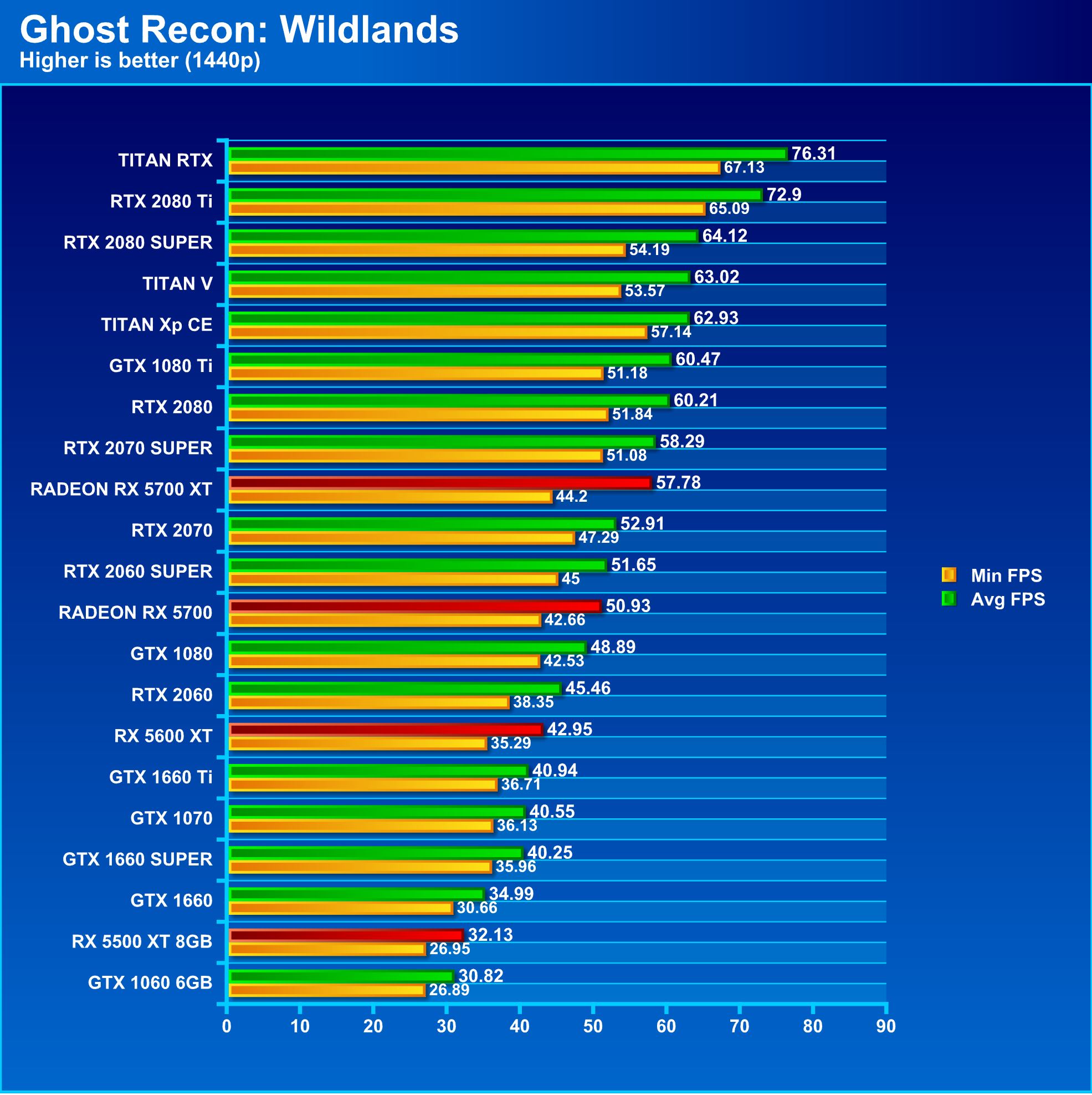 Ghost Recon: Wildlands is a veritable torture test of a game that now shows a reverse of what Far Cry 5 was showing. Here, the RX 5600 XT falls in line as expected at 1080p, and 1440p. However, 4K the RX 5600 XT pulls a small but defined lead ahead of the RTX 2060 which means the 5600 XT is punching a bit above its weight class.