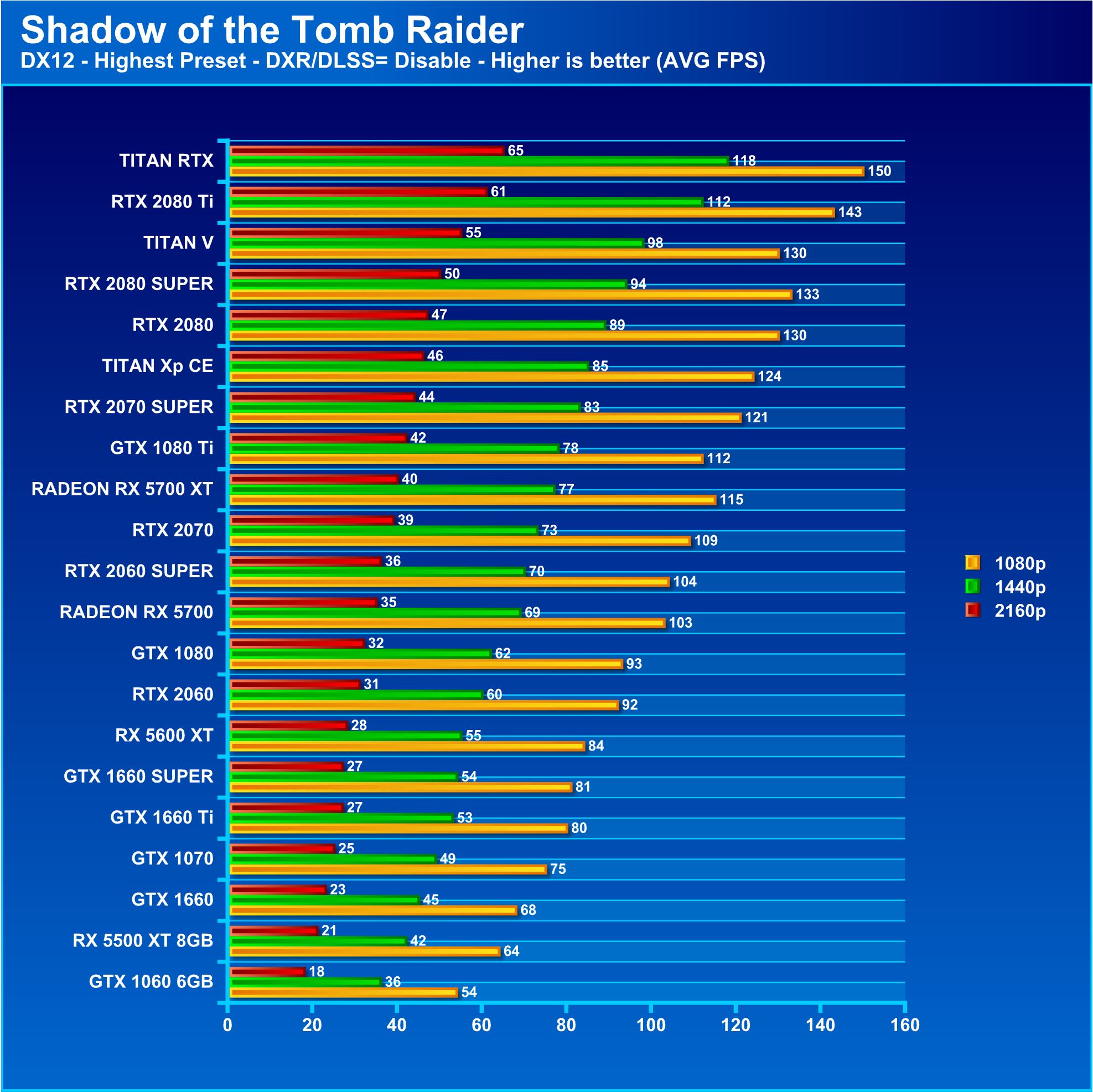 Now we’re getting into the territory of a game more optimized for the higher performance GPUs. Shadow of the Tomb Raider is an awesome game and part of a long-lasting franchise. It supports full DX12 along with new RTX features which we may start to include in testing once Radeon options have ray-tracing capabilities enabled. We run at max details at DX12 with RTX and DLSS disabled.