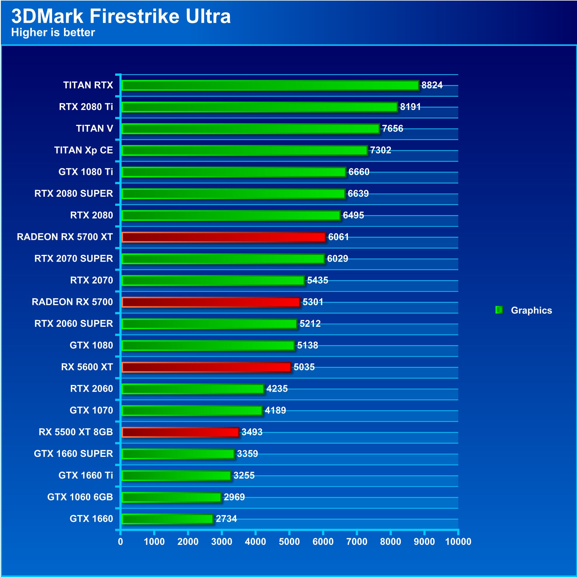 3DMark Firestrike shows the RX 5600 XT pulling up in between the 2060 and 1080 on the extreme variant. Moving to ultra and the 5600 XT falls in line behind the 1070 and ahead of the 1660 SUPER. This is not a bad result and about where we expected it to be, as this benchmark is an older one but still applicable.