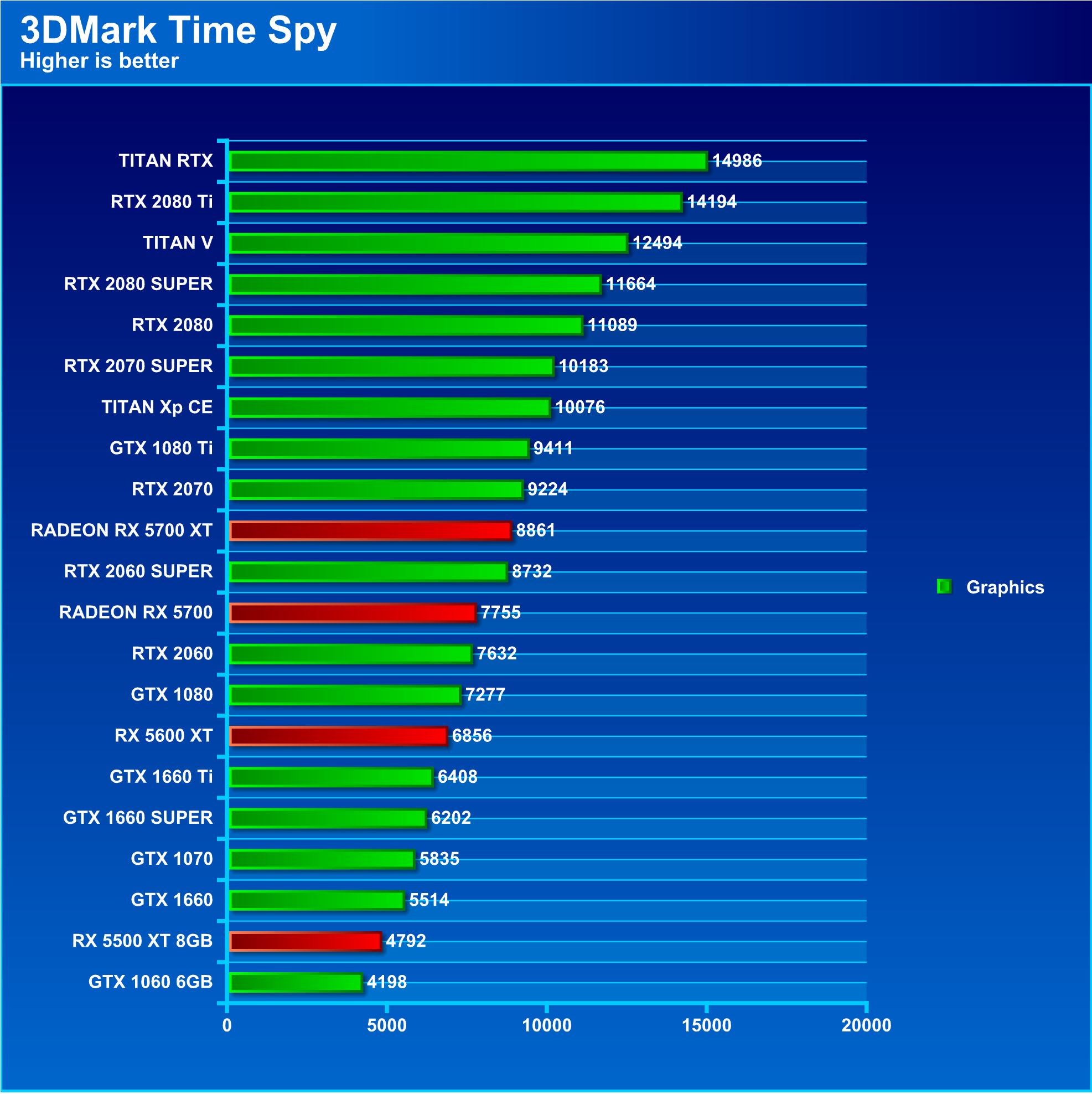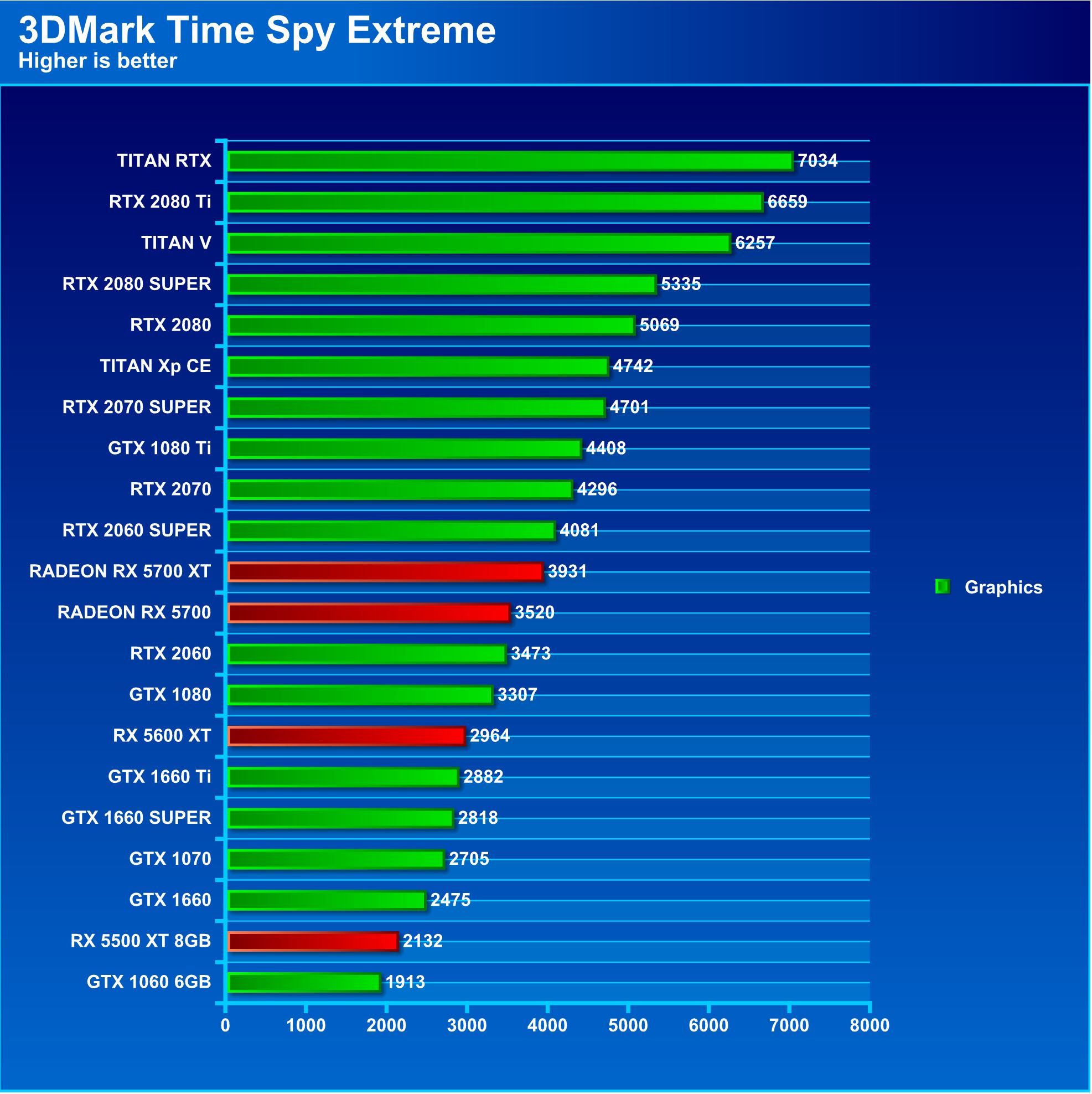 Time Spy being the newer benchmark, we see the RX 5600 XT falling a bit, slotting itself behind the 1080 and 2060 and ahead of the 1660 Ti.