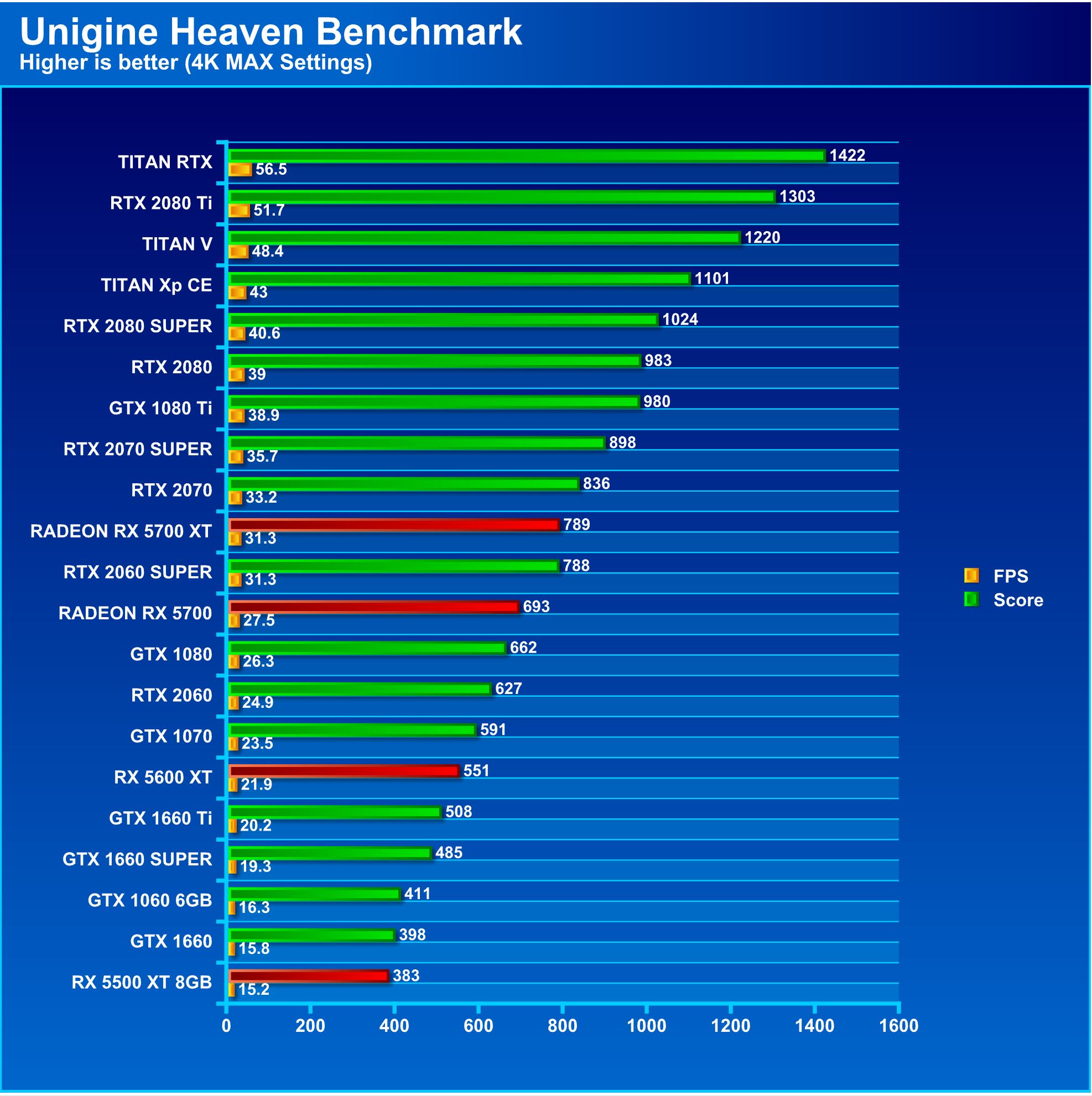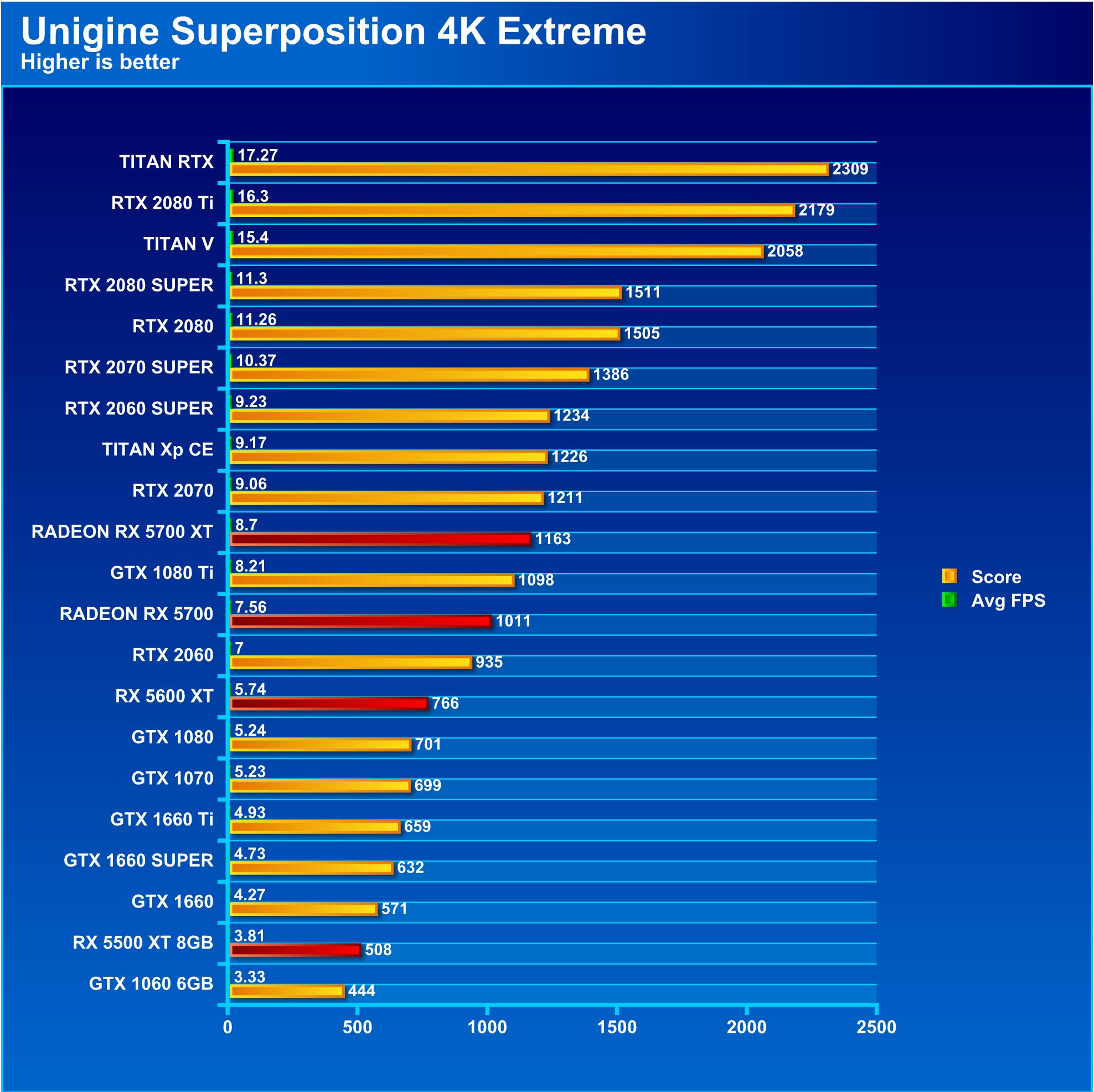 Unigine superposition being the newer benchmark we now see the RX 5600 XT surpass the aging Pascal 1070 and 1080 while still trailing the RTX 2060.