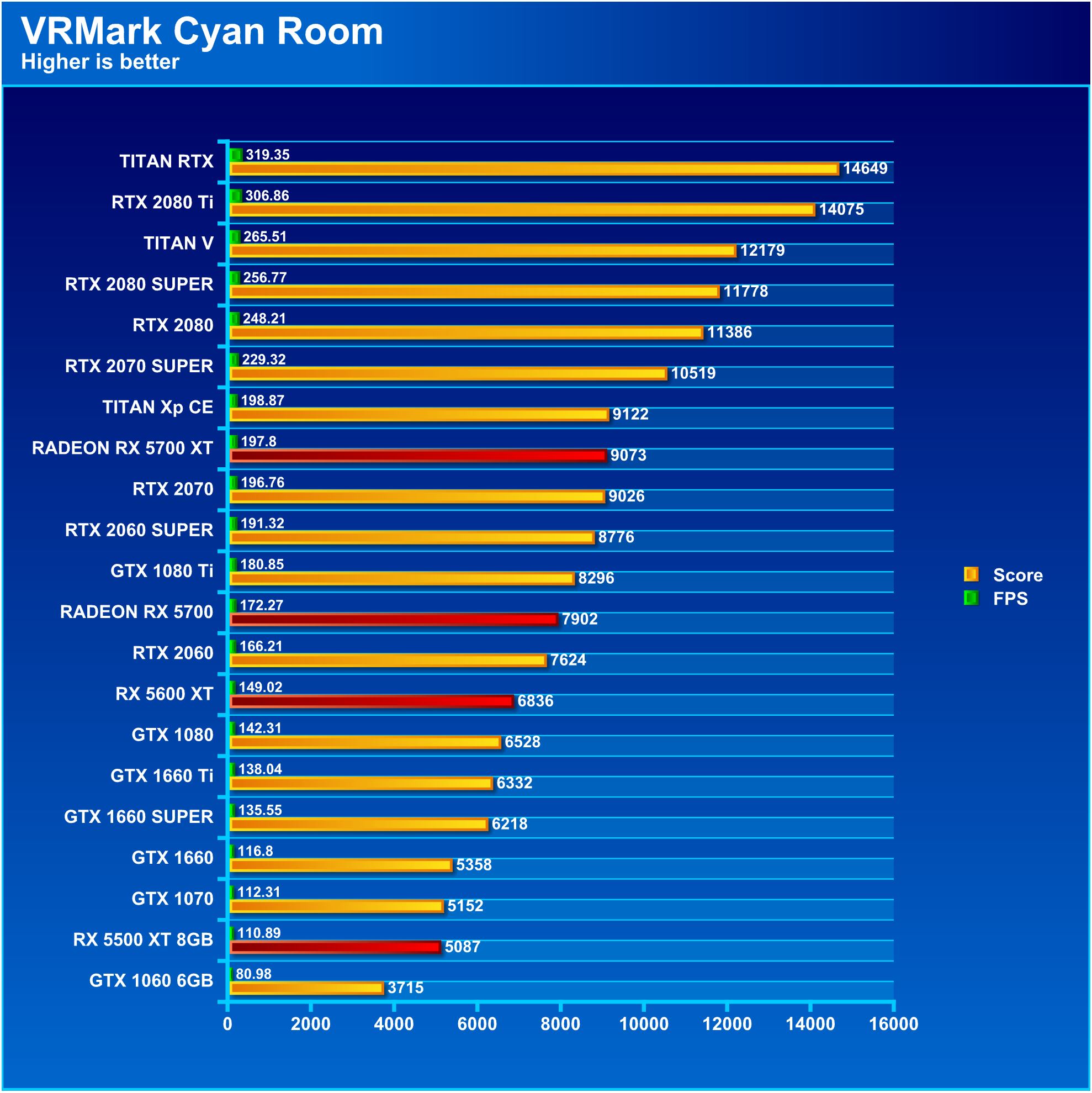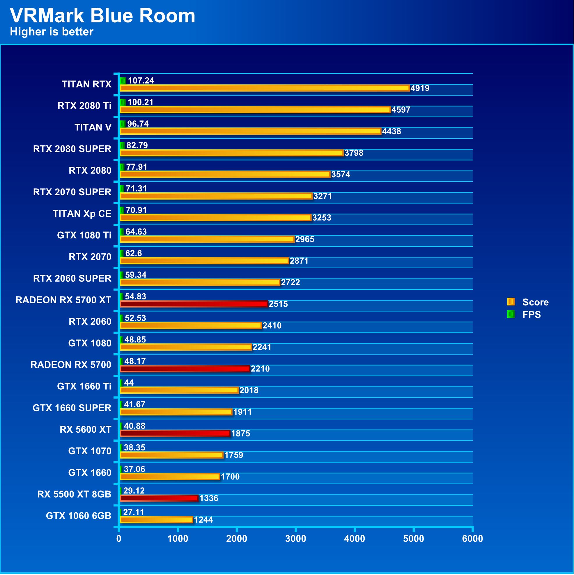 VRMark is more of the same as the RX 5600 XT finds itself between the 2060 and the 1080 on the lighter loading CYAN test. Moving to the heavier Blue test, and we see the 5600 XT fall a bit more to a spot below the 1660 SUPER and above the 1070.