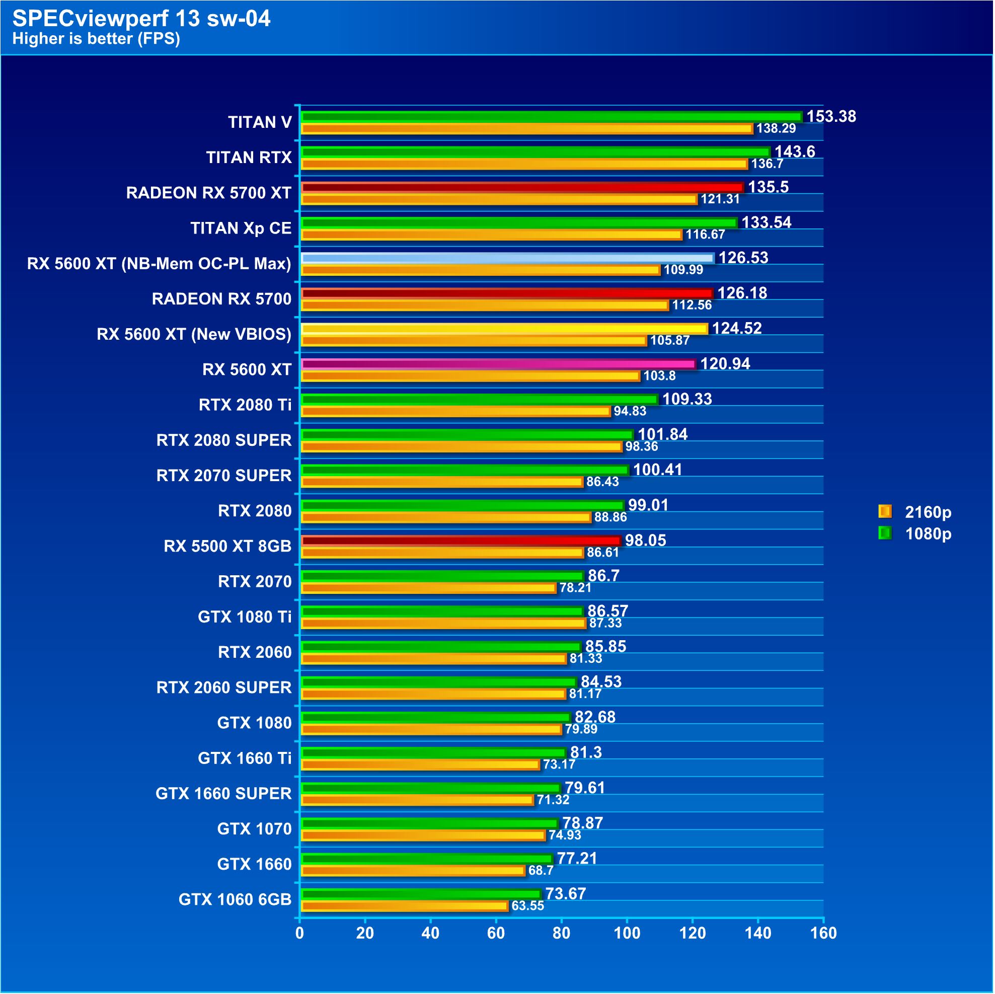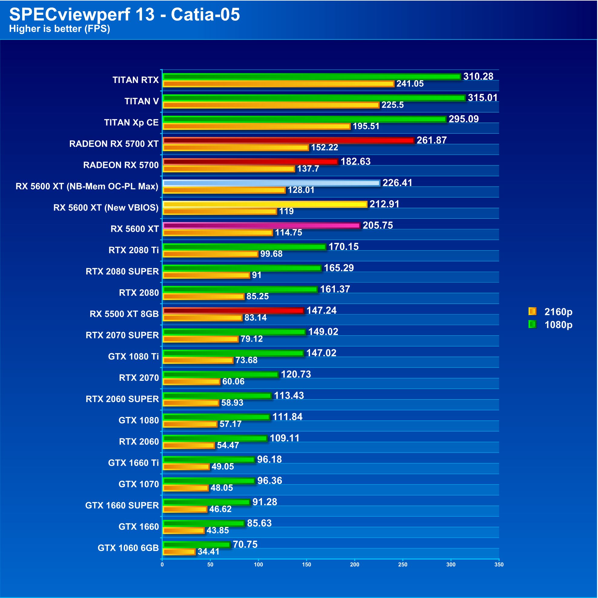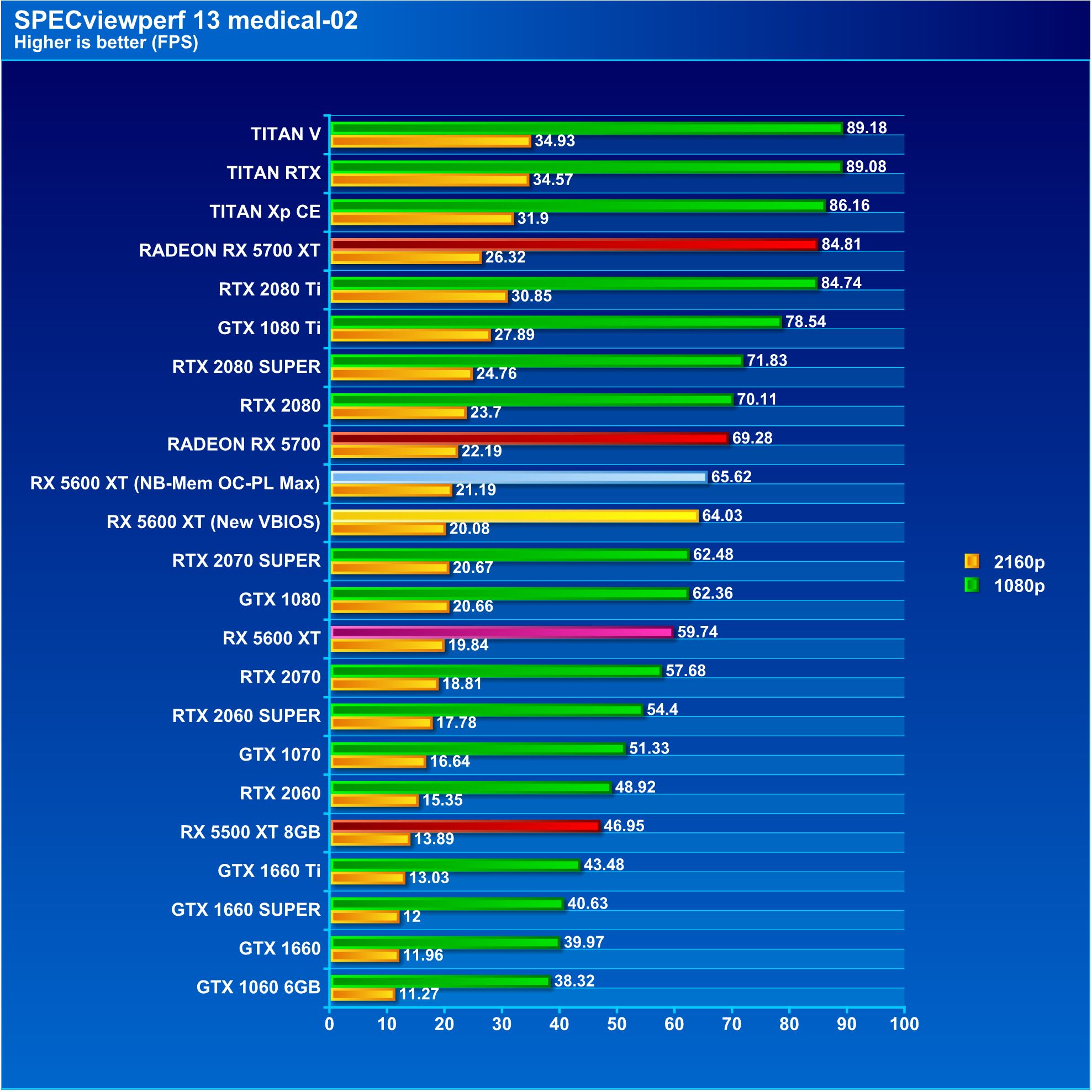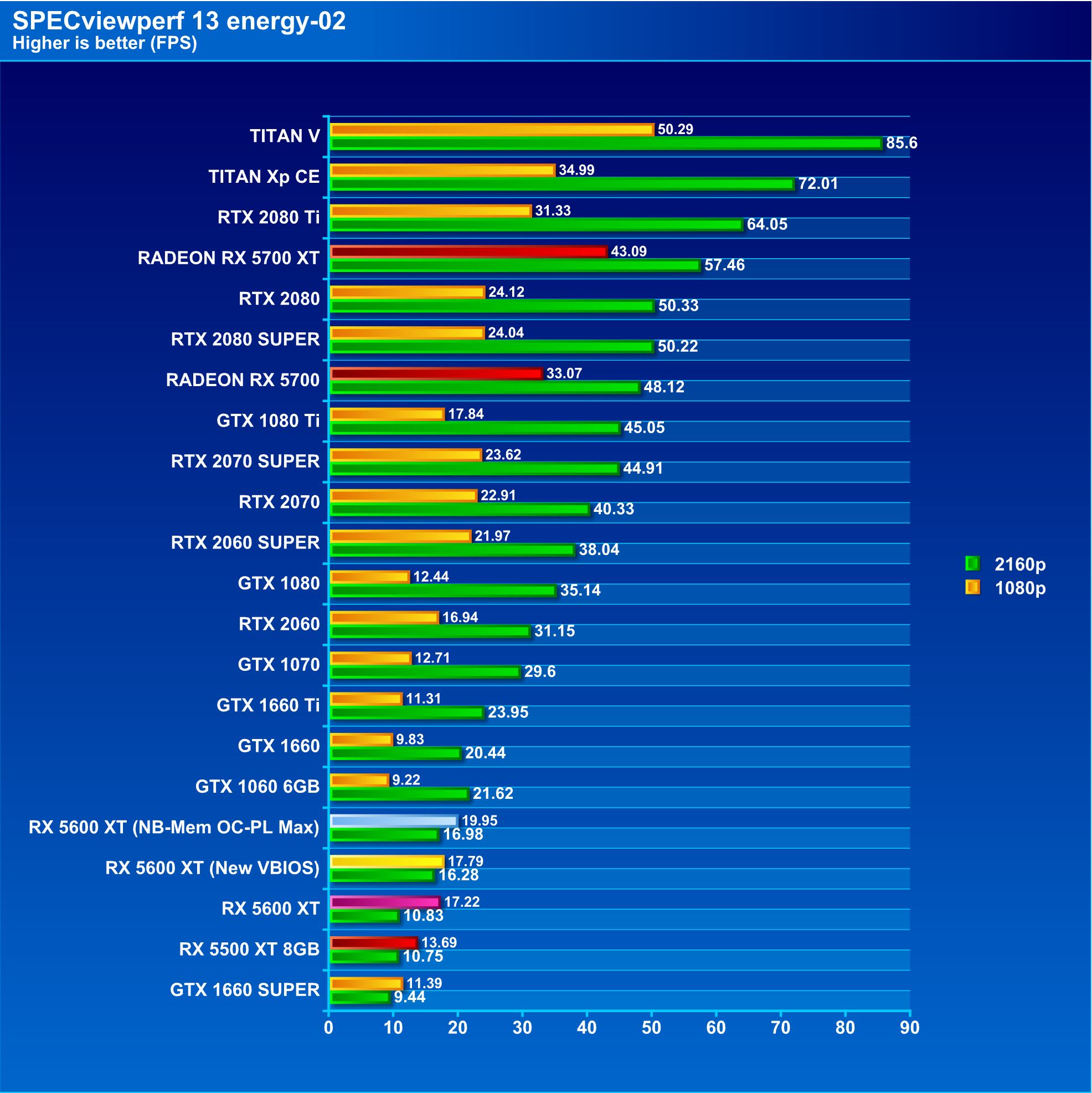 The SPEC tests are designed to simulate professional level workloads and your GPU’s ability to render with these workloads. The RX 5600 XT Thicc II Pro and its new VBios show its first signs of gaining some significant steam here. One thing worth noting is that the new VBios with the increased memory speed displaces or is right on the heels of the RX 5700, which is a bit surprising.