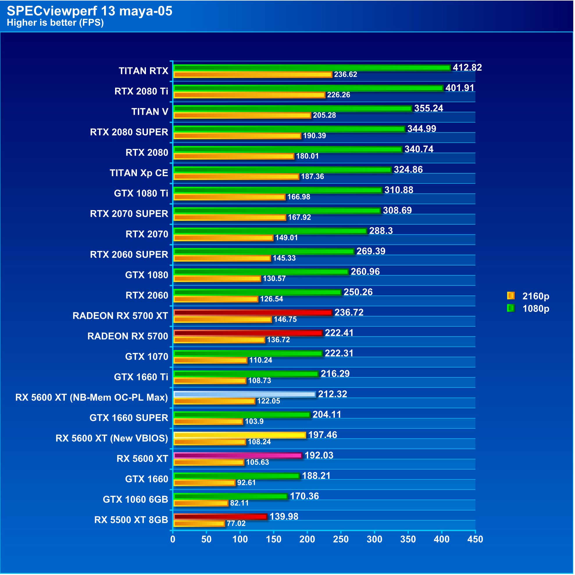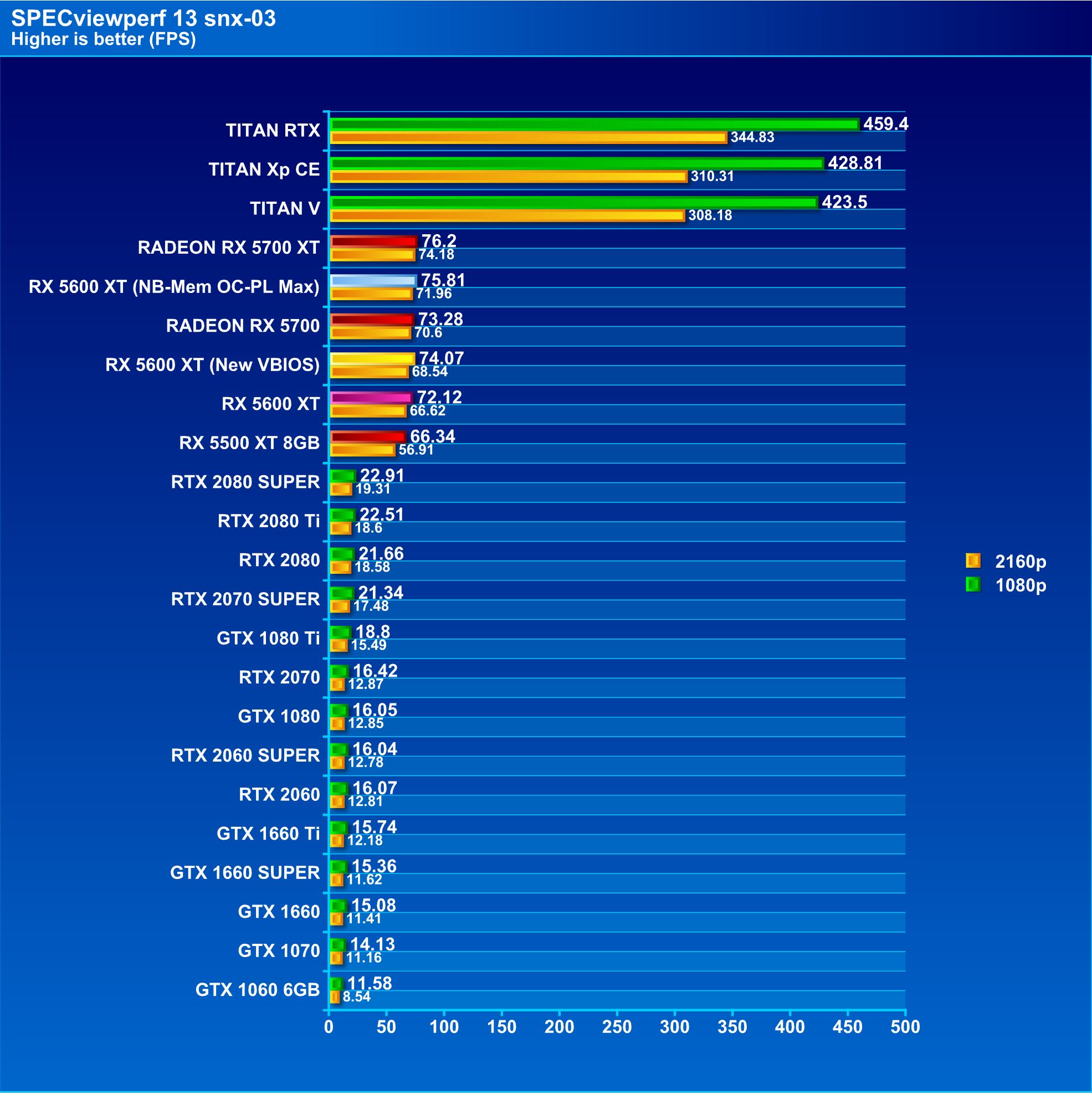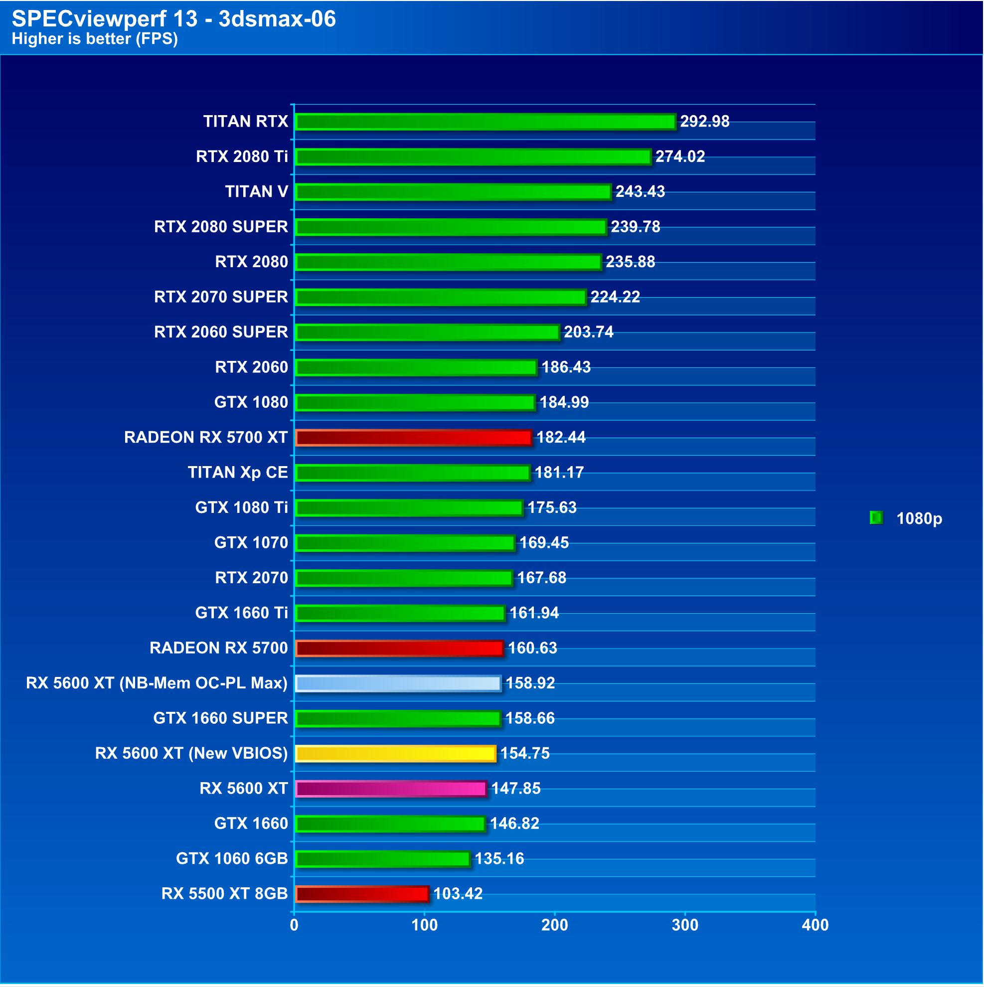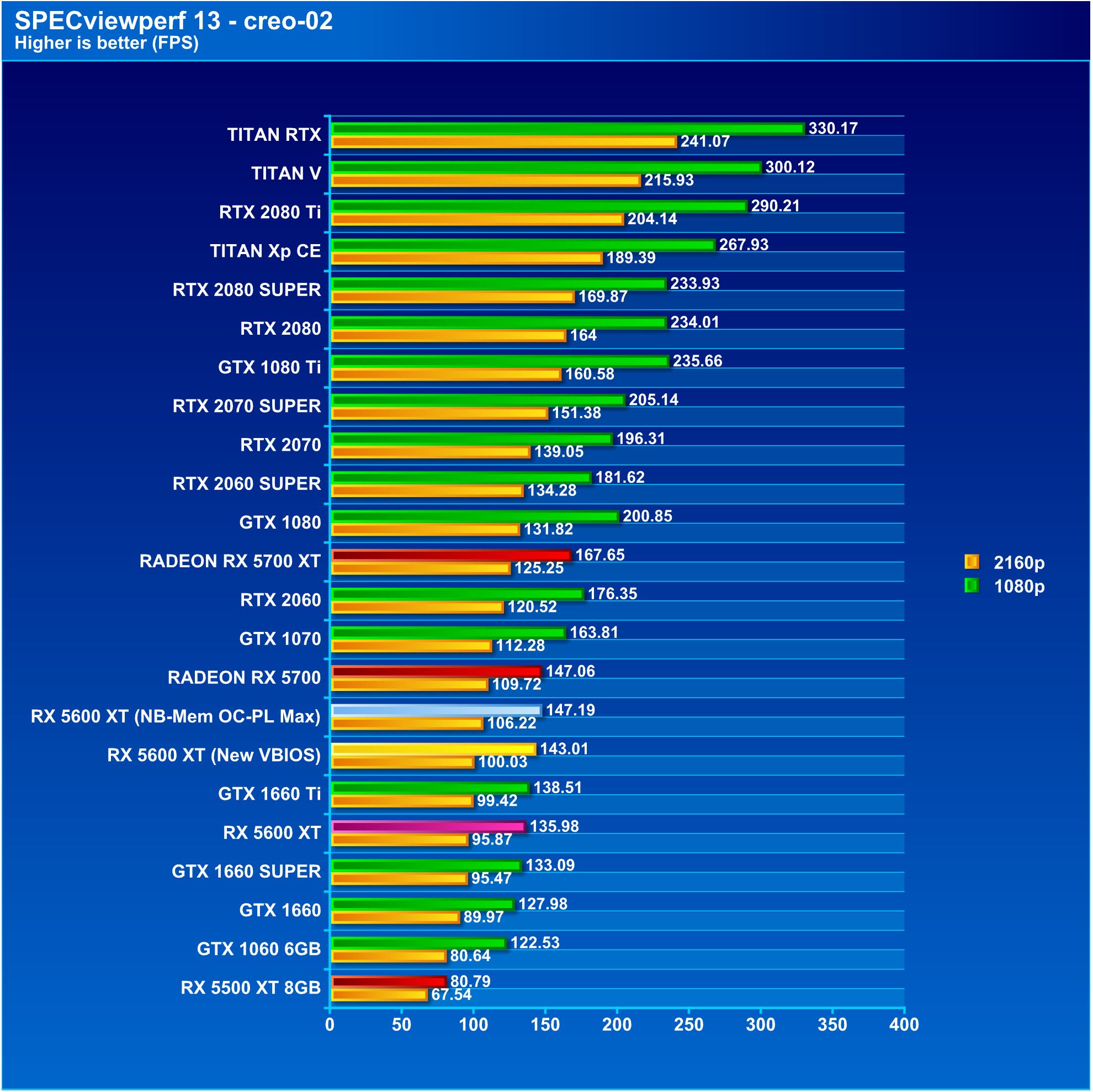 The SPEC tests are designed to simulate professional level workloads and your GPU’s ability to render with these workloads. The RX 5600 XT Thicc II Pro and its new VBios show its first signs of gaining some significant steam here. One thing worth noting is that the new VBios with the increased memory speed displaces or is right on the heels of the RX 5700, which is a bit surprising.