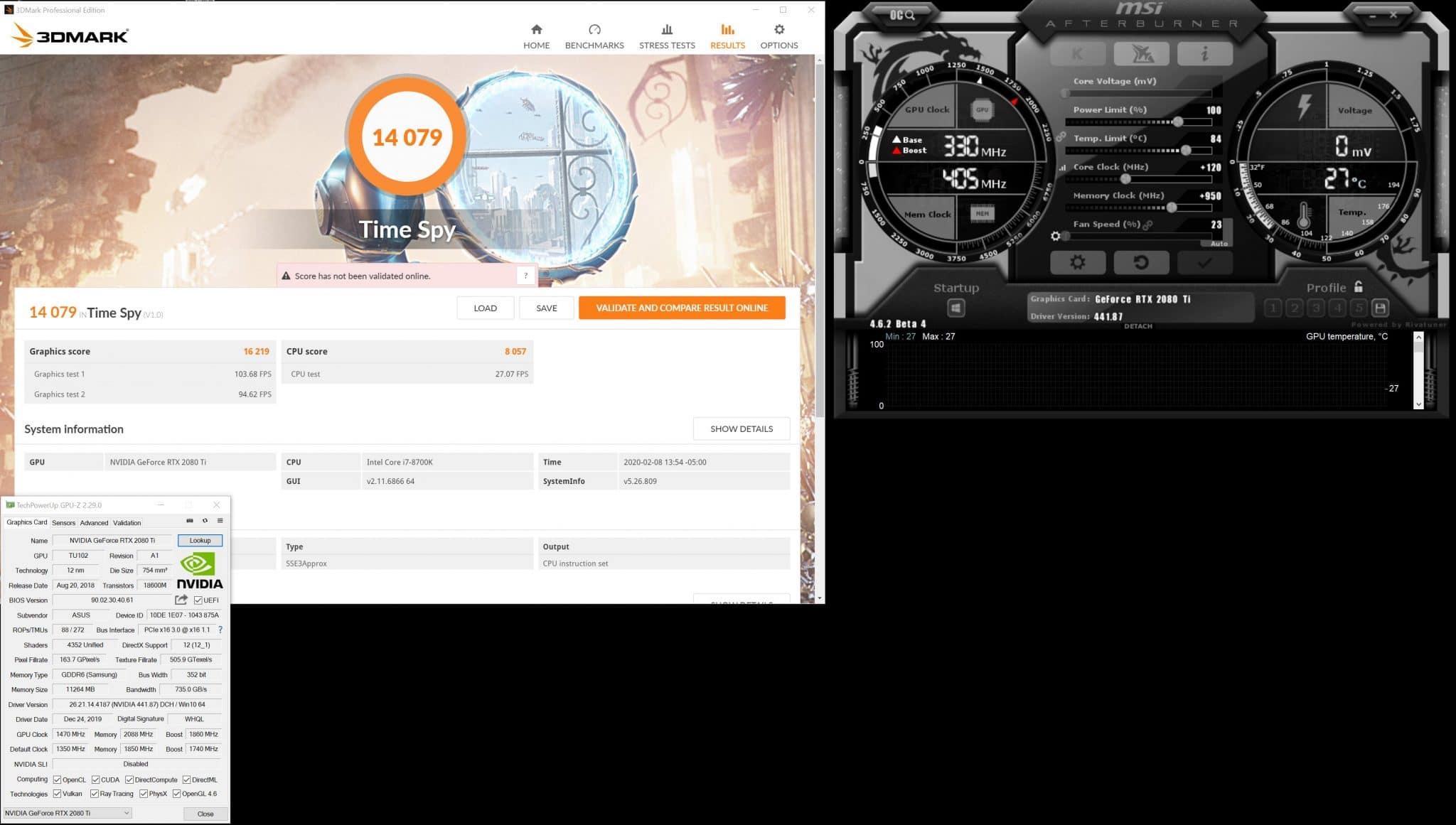 Memory on the ASUS, we see 14,798MHz as read during testing. Turning things up, and we get the card up to +950 or 16,698MHz effective clock speed from the Samsung GDDR6. This overclock is a roughly 12% increase over the out of the box clock and the maximum we could get out of the card due to power limit restrictions.