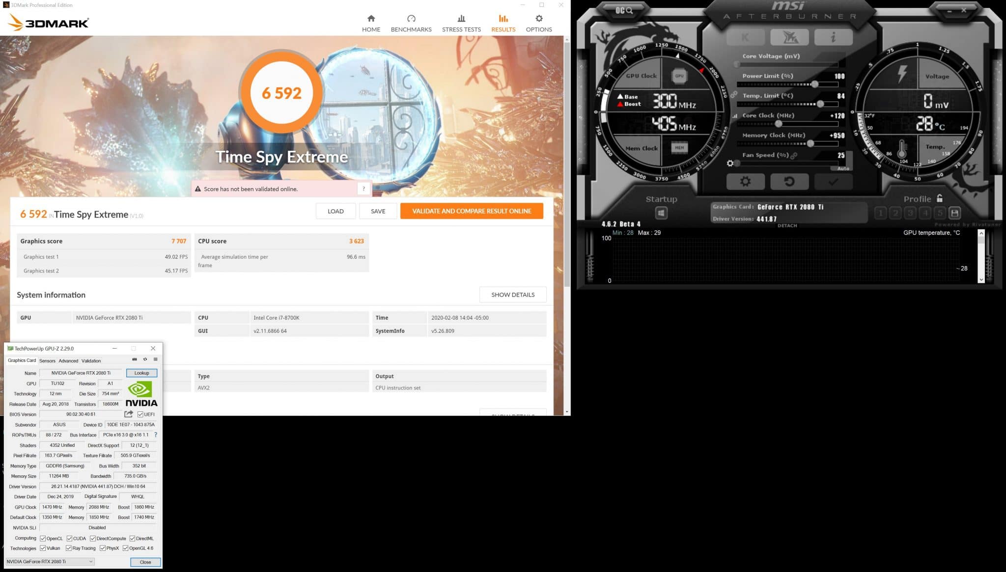 Moving to Time spy extreme, we see the overclock deliver another 7% gain, which puts the ASUS 2080 Ti well above the TITAN RTX, to which it had fallen by a small margin previously.