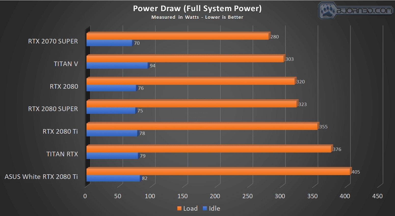 Power draw for the ASUS STRIX 2080 Ti topped at 405W, which we found that the enhanced power limit causes a draw of over 29W more than the full system load with the TITAN RTX equipped, and 50W higher than the FE 2080 Ti. Keep the thermals in mind we just observed as that’s one hell fo a result for pulling a solid 50W over the FE model.