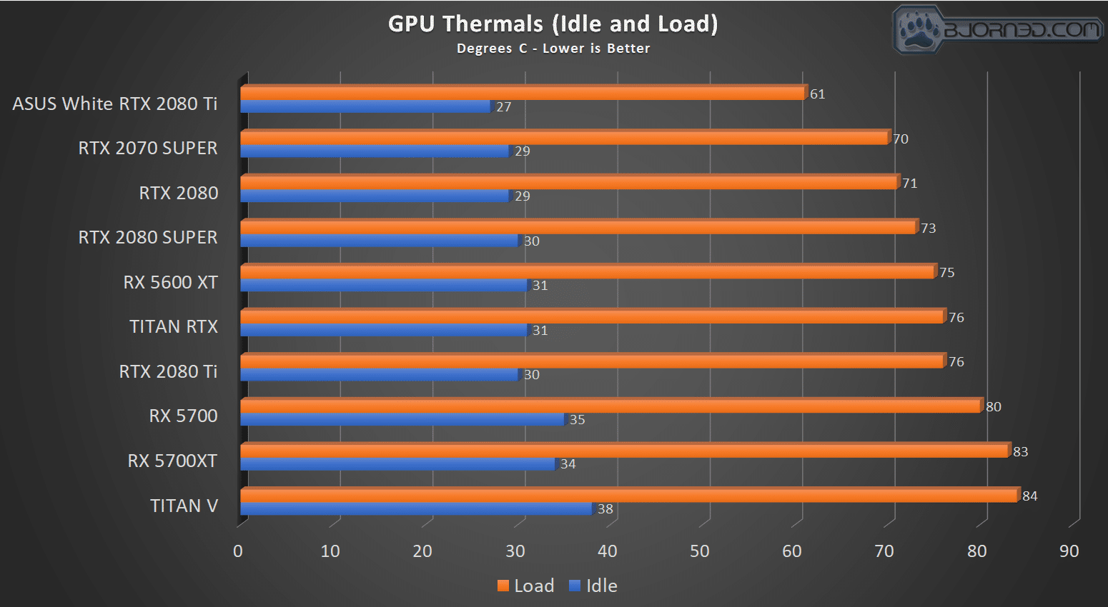 We observed idle tempos down to the 27C range with a 22C thermally controlled environment, giving us a delta of just 5C above ambient. Under load, we saw a peak of 61C, which was a delta of 39C and is almost 10C cooler than the next comparable card at this performance level. Compared to the vapor chamber cooled FE card, we are 23C cooler.