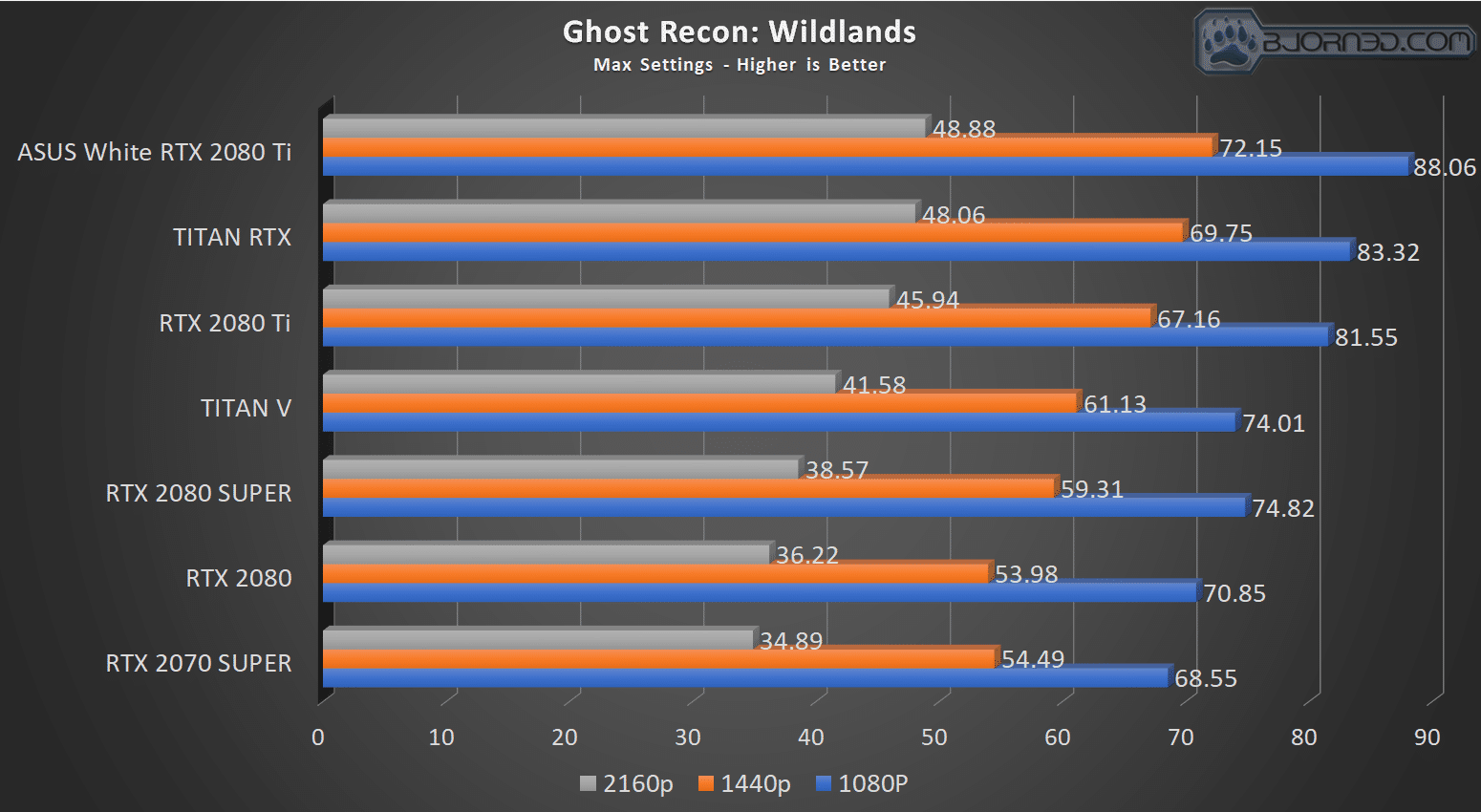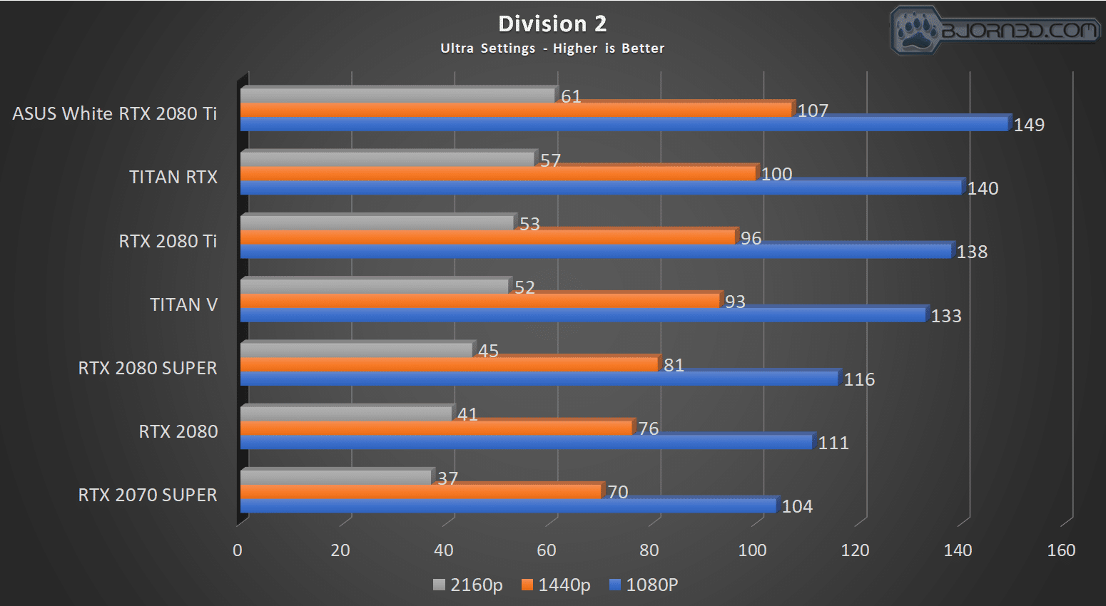 Division 2 is the last of the newer benchmark games we have added to our suite, and once again, the ASUS 2080 Ti jumps ahead. Much like we will see in Wildlands, they seem to be very stressful and show identical scaling at all three tested resolutions.