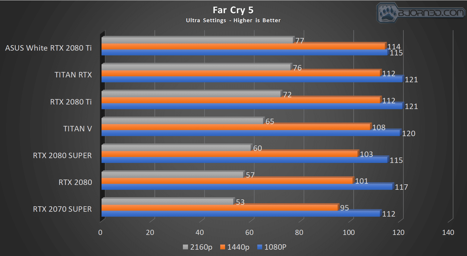 Far Cry 5 shows more of the same here. The ASUS RTX 2080 Ti at 4K shows 7% over the 2080 Ti FE model, however, do note that at the top end of Nvidias GPU stack, the cards get bottlenecked below 4K, which is why in gaming tests you wills ee the framerates bunch up as the GPU can be left waiting on the platform to feed the GPU frames to render.