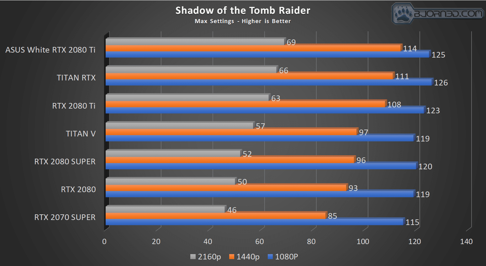Shadow of the Tomb Raider was interesting as we had to retest every Turing based GPU since the newest Nvidia driver gave bumps in performance between 2 – 10%, which changed the chart up quite a bit. We see the RTX 2080 SUPER is right at the heels of the TITAN V here with the 1080p score beating the TITAN V but alas the two higher resolutions the TITAN V edged ahead of the RTX 2080 SUPER once again.