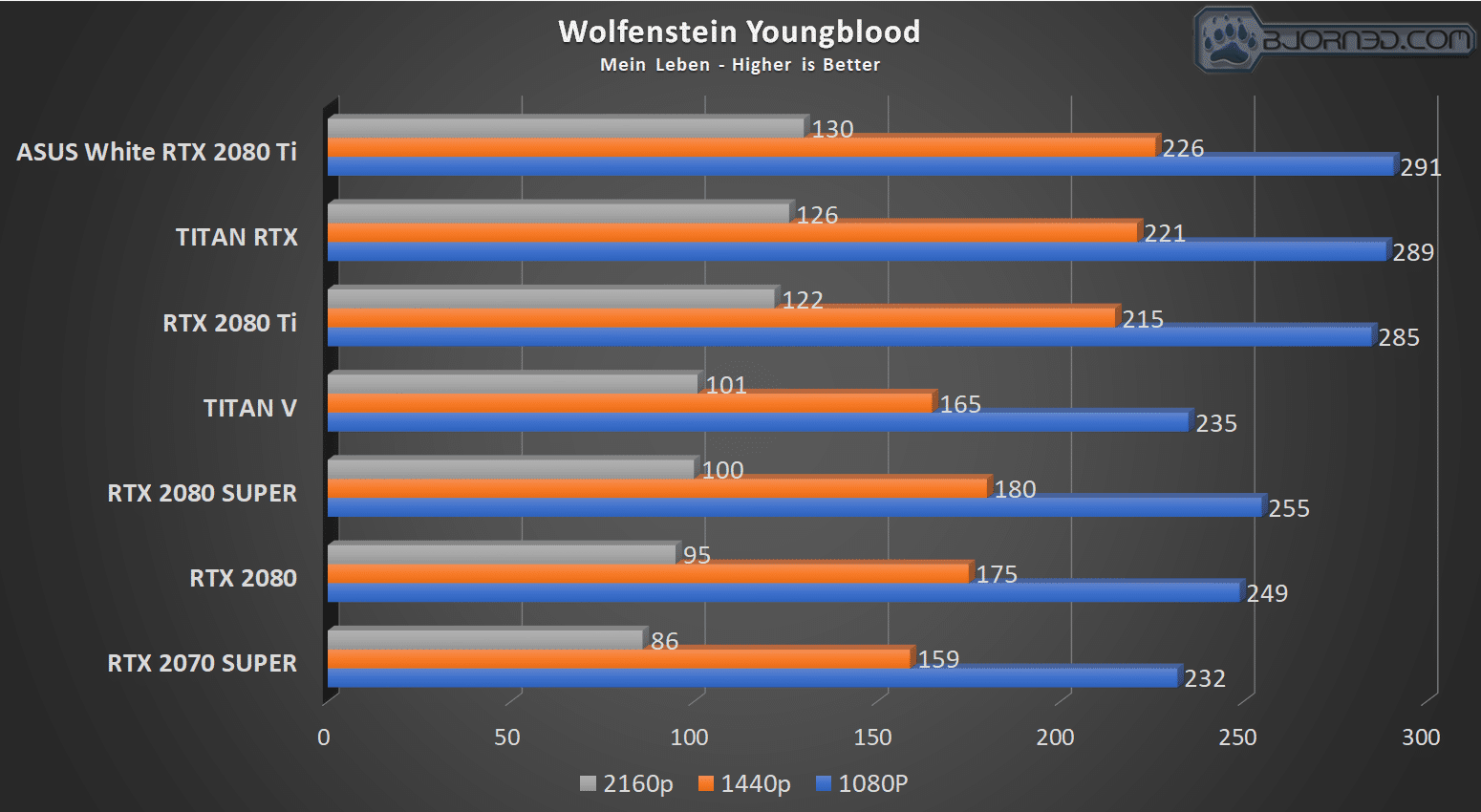 Wolfenstein Youngblood is a newer title for our benchmark suite. While it is a visually beautiful game, I man happy to see that with RTX disabled for comparison, and we can pull numbers deserving of a high refresh rate display. The ASUS RTX 2080 Ti takes a commanding lead here at 4K. as we have observed, pulling a 4% lead over the TITAN RTX and 7% over the FE 2080 Ti.