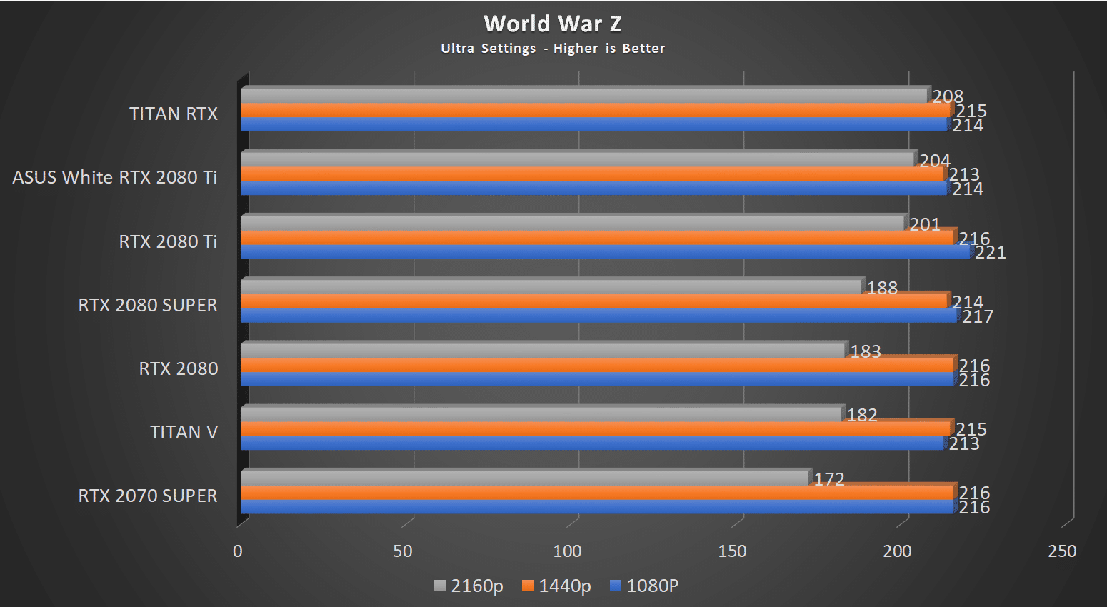 World War Z runs in Vulkan API, which means you will see quit high FPS numbers, but at 4K, we get some delineation with 2% gain over the FE model; however, the TITAN RTX takes the top spot here again. Unfortunately for the lower resolutions, we see the bottlenecking rear its ugly head again.,
