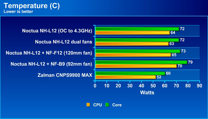Knowing the size of the NH-L12 and the fact that it has only four heatpipes to conduct heat away from the base, we do not expect that it will take any performance titles. Taking this into consideration, the performance of the NH-L12 is quite respectable.